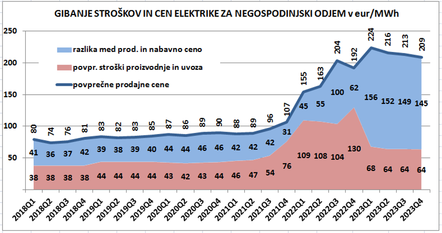 Iz slike je lepo razvidno, da so bile v preteklosti proizvodne cene elektrike v prodaji negospodinjskim odjemalcem nadgrajene z okoli dodatnih 40 eur/MWh za stroške prodaje in distribucije ter zaslužke elektrogospodarstva. Konec leta 2021, ko so proizvodne in uvozne cene pričele naraščati, istočasno beležimo tudi porast prodajnih cen za negospodinjske odjemalce, a v povprečju več kot so porasli stroški. Razlika med prodajnimi in oskrbnimi cenami elektrike se je tako v letu 2022 celo povečala, še večje odstopanje pa je bilo v letu 2023. Takrat so stroški domače proizvodnje upadli, prav tako uvozne cene, znižal pa se je tudi delež uvoza. Vseeno pa statistika kaže, da so prodajne cene lani ostale na približno enakem nivoju, verjetno kot posledica podpisanih dolgoročnih pogodb o nakupu elektrike iz leta 2021 in 2022. Razlika med stroški oskrbe z elektriko iz domačih elektrarn in uvoza do prodajnih cen se je tako povečala s 40 eur v letih 2018-2021 na okoli 140 eur/MWh, kar seveda pomeni večji zaslužek pri prodaji elektrike.
