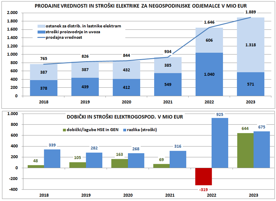 Na prvi sliki je prikazana vrednost prodane elektrike za negospodinjske odjemalce glede na količino nakupa ter omenjene prodajne vrednosti. Nato pa so izračunani tudi stroški proizvodnje te elektrike v elektrarnah in uvoza na osnovi česar lahko izračunamo razliko za pokrivanje vseh stroškov prodaje in distribucije ter tudi zaslužkov v elektrogospodarstvu. Ta razlika se je v vseh letih do 2021 gibala okoli 400 mio eur pri negospodinjskih odjemalcih, v letu 2022 je kljub porastu stroškov proizvodnje in uvoza porasla na 600 mio eur, ker so prodajne cene v povprečju zrasle še več. Lani pa so bile prodajne cene celo še nekaj višje, znižale pa so se domače proizvodne cen, uvozne še bolj in razlika se je povečala kar na 1,3 mio eur. Toliko sredstev naj bi torej ostalo v elektrogospodarstvu za pokrivanje vseh stroškov ter njihov dobiček.