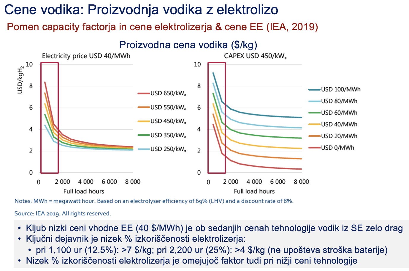 Zeleni vodik bi bilo mogočle stroškovno konkurenčno proizvajati samo ob stanovitnem viru električne energije in pri njeni zelo nizki ceni. V praksi je to mogoče samo z elektriko iz amortiziranih hidro in jedrskih elektrarn, ki poslujejo z nizkimi obratovalnimi stroški (cena elektrike med 25 in 30 EUR/MWh). Vsi ostali viri elektrike so mnogo predragi ali nestanovitni.