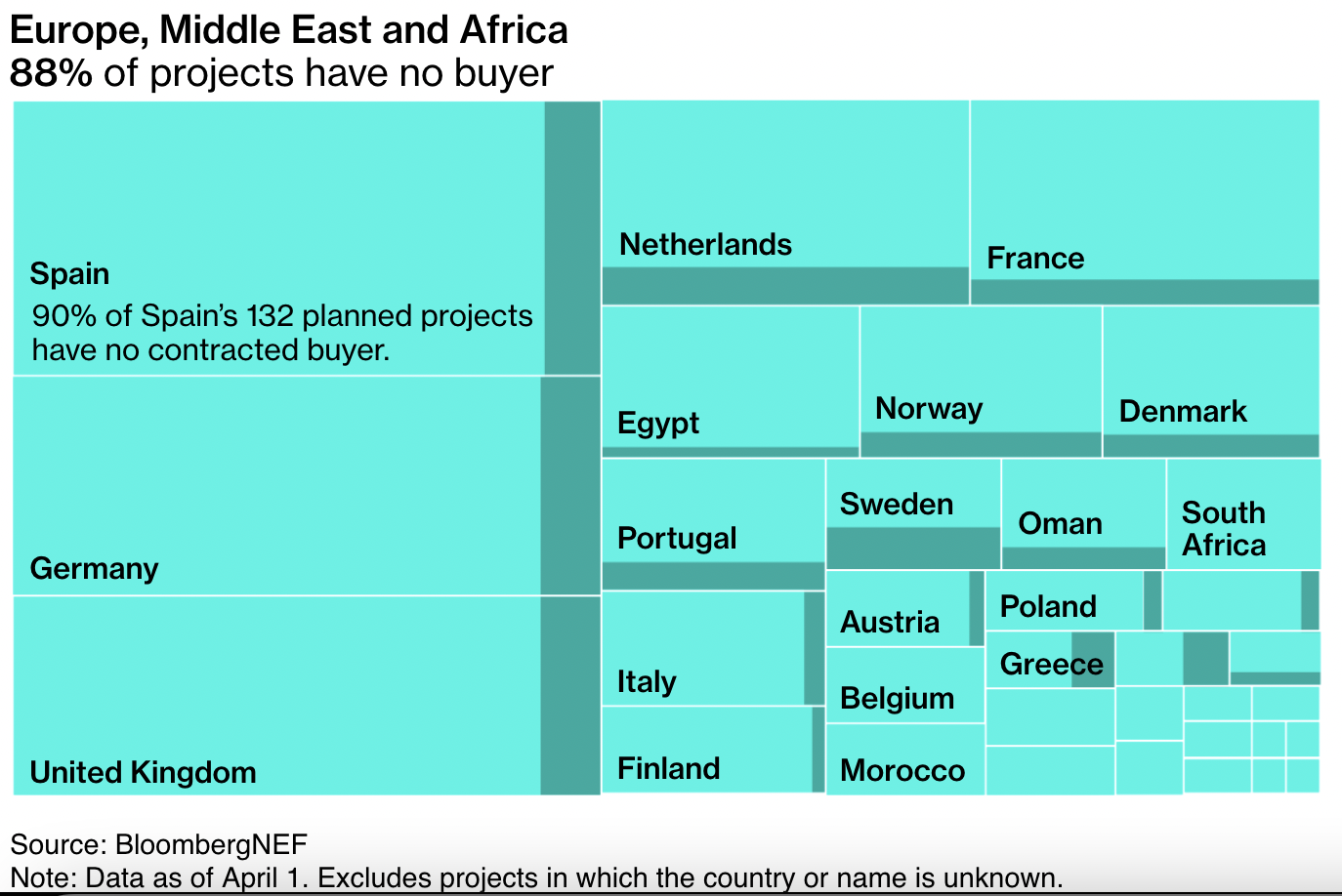Prejšnji teden je Bloomberg objavil članek z naslovom “Zakaj skoraj nihče ne kupuje zelenega vodika?“. Članek je napisan na podlagi podatkov Bloombergove specializrane edicije za energijo BloombergNEF. V glavnem, članek ugotavlja, (1) da je zelo malo projektov za proizvodnjo zelenega vodika dobilo končno investicijsko odločitev, in (2) da se tudi tisti projekti, ki so v procesu investicije, ubadajo s kroničnim pomanjkanjem kupcev, saj 90 % projektov nima zagotovljenega niti enega kupca (pogodbe za dolgoročni odjem vodika). V ZDA 77 % izmed 111 načrtovanih projektov nima niti enega kupca, v Kitajski 90 % izmed 370 načrtovanih projektov nima niti enega kupca, v Španiji 90 % izmed 132 načrtovanih projektov nima niti enega kupca itd.