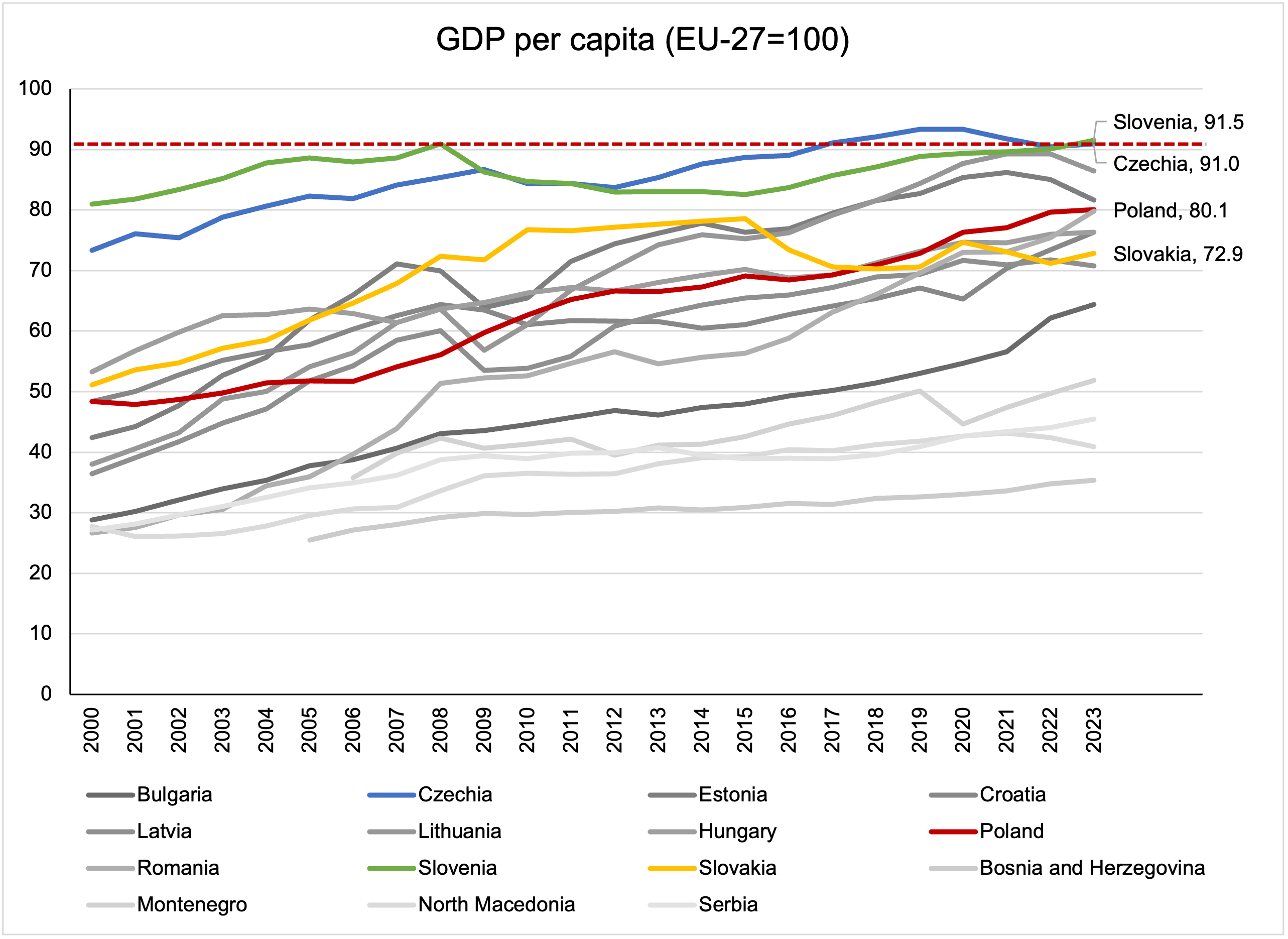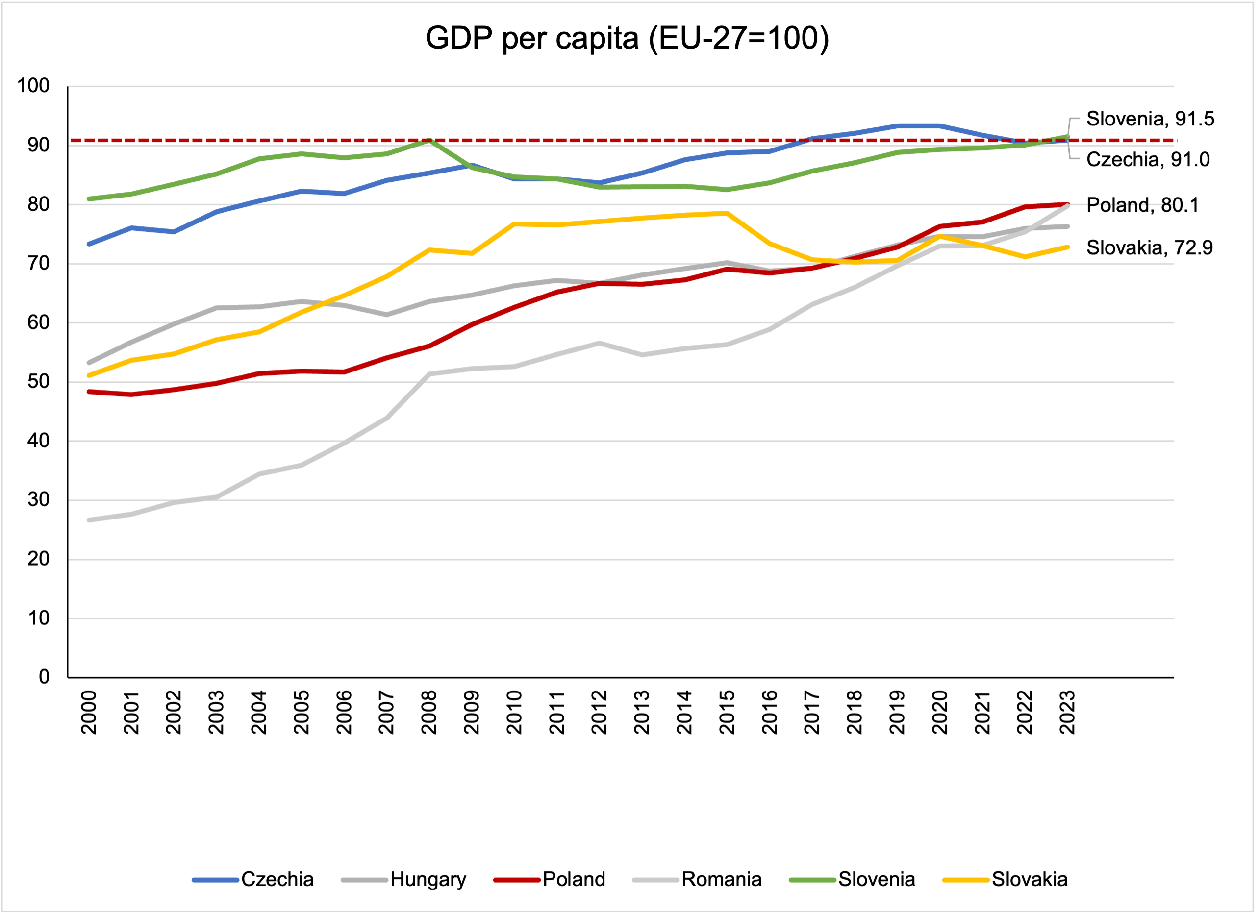 Zgornje primerjave temeljijo sicer na realnih podatkih (stalne cene iz 2010), vendar pa je za ustreznejšo primerjavo blaginje med državami treba upoštevati tudi razlike v ravni cen med državami. Bolj razvite države (z višjim BDP per capita) imajo običajno dražjo hrano, dražje nepremičnine in najemnine in dražje storitve, zato je za realnejšo primerjavo treba upoštevati te razlike v cenah košarice dobrine, kar nam omogoča metodologija kupne moči (PPP). Druga slika kaže, da je tudi po pariteti kupne moči Slovenija najbolj razvita država med nekdanjimi socialističnimi državami. Po letu 2012 jo je sicer prehitela Češka, vendar je zaradi slabše gospodarske dinamike v letih 2022-2023 Češka spet zaostala za Slovenijo.