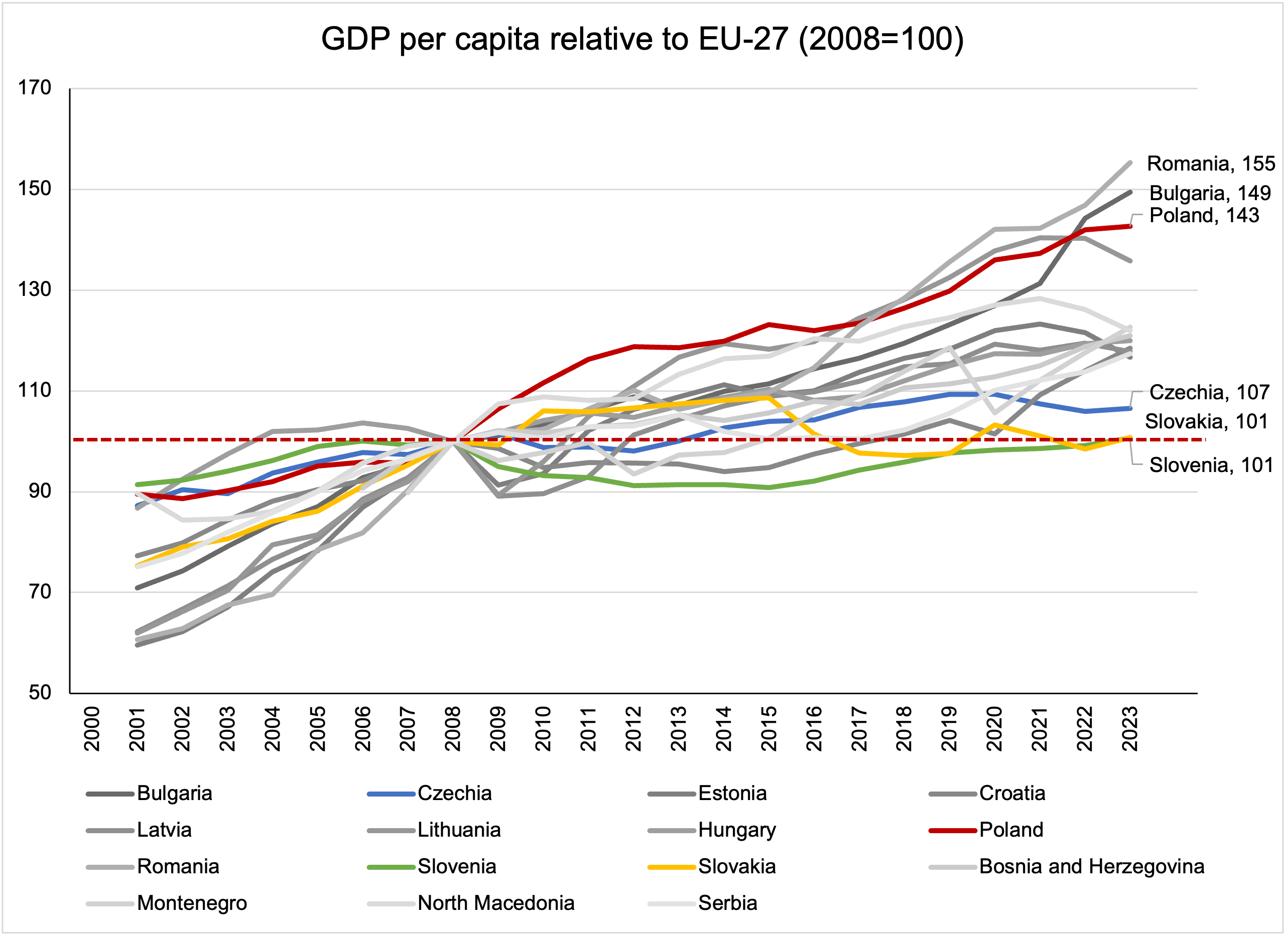 V spodnji sliki sem izločil večino držav in prikazujem samo dinamiko 6 najbolj zanimivih držav. ker so prikazane primerjave glede na povprečje, naraščajoč trend kaže, da je država po BDP per capita rasla hitreje od povprečja EU. Najbolj impresivno dinamiko rasti je imela Romunija, ki je s 27 % povprečja EU v 24 letih prišla na 80 % povprečja EU (nadoknadila je 53 odstotnih točk razlike!). Podobno impresivno dinamiko je imela Poljska, ki je v 24 letih nadomestila 32 odstotnih točk razlike do povprečja EU.