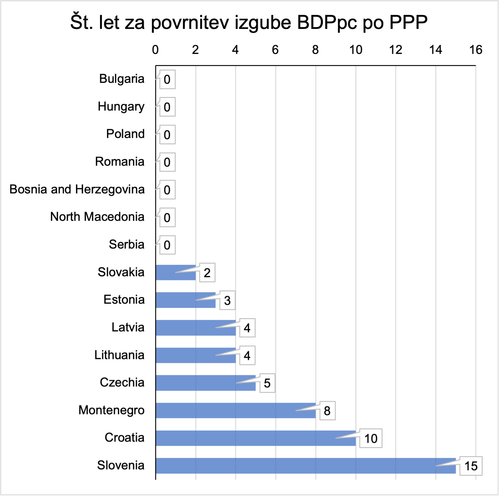 Zgornja slika tudi kaže temno plat slovenske gospodarske dinamike po finančni krizi iz 2008. Slovenijo je kriza podobno prizadela kot druge države (razen Poljske in držav Zahodnega Balkana), vendar so v ostalih državah krizo hitro rešili, čemur je sledilo (bolj ali manj) hitro okrevanje. V Sloveniji smo s sanacijo bank čakali 5 let, kar je krizo podaljšalo na 5 let (okrevanje se je začelo šele v drugi polovici 2013) in potrebovali smo 10 let, da se vrnemo na raven realnega BDP iz leta 2008.