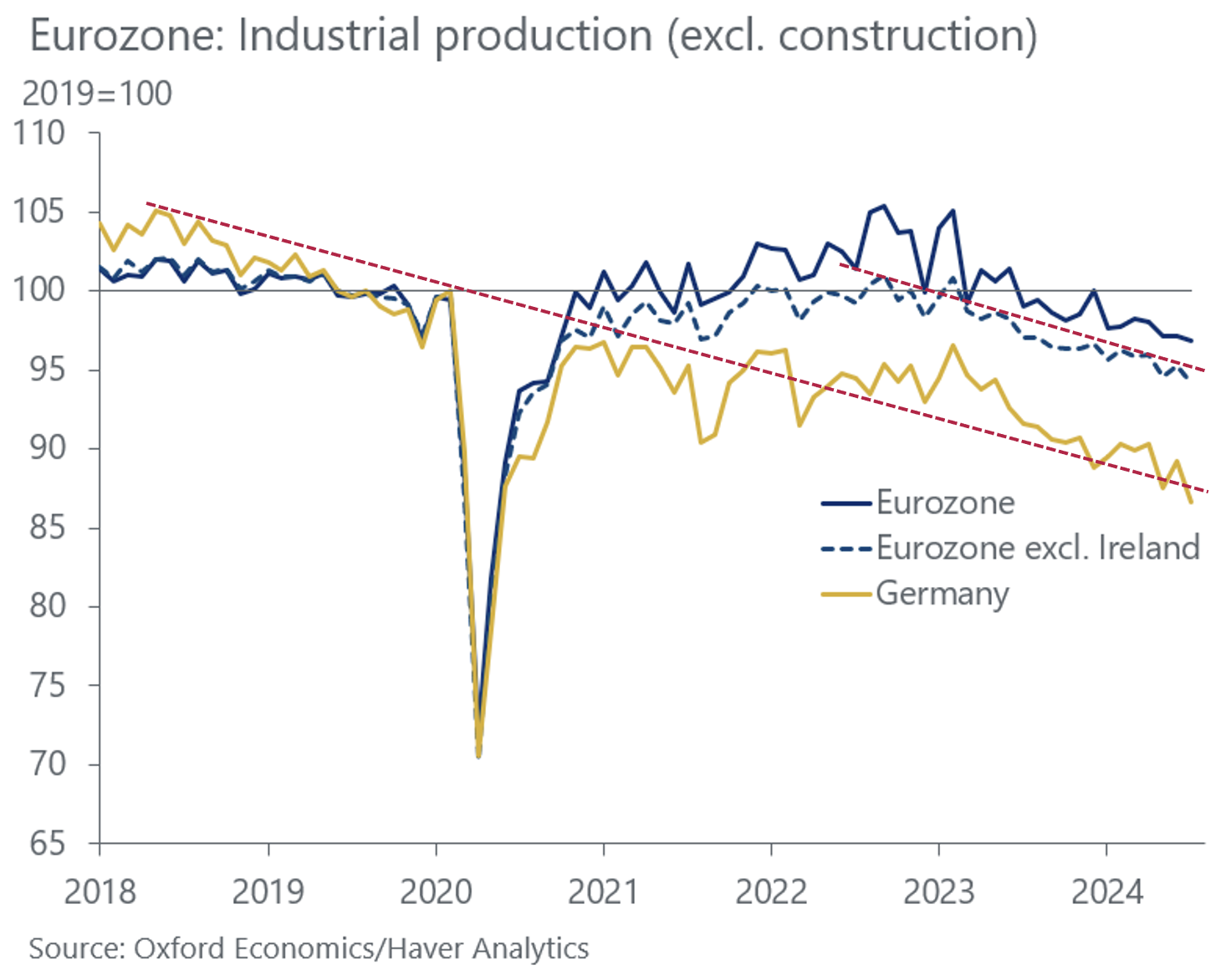 Nemška industrija je v prostem padu. In ker Nemčija predstavlja 27 % v industrijski proizvodnji EU, hkrati pa je močno dobaviteljsko povezana z ostalimi članicami, s tem s seboj v globino vleče celo evrsko območje.
