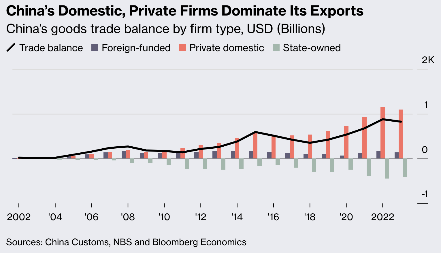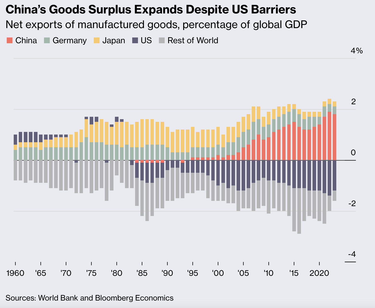 China’s production prowess is at historic heights: Its manufactured goods trade surplus is the largest relative to global GDP of any country since the US right after World War II. Chinese companies like BYD Co. and Contemporary Amperex Technology Co. Ltd., known as CATL, are world leaders in making goods such as EVs, batteries and solar panels — the pillars of Xi’s “new productive forces” to drive growth as authorities seek to deflate a property bubble.