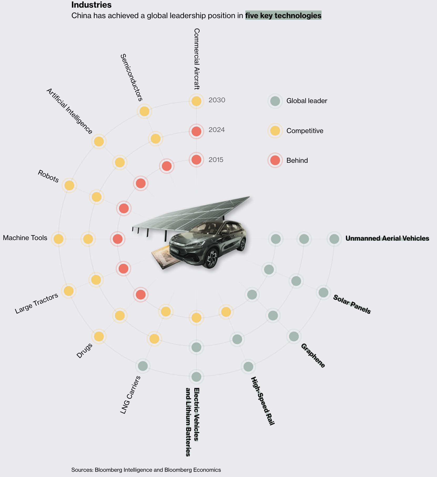 But despite more than six years of US tariffs, export controls and financial sanctions, Xi is making steady progress in positioning China to dominate industries of the future. New research by Bloomberg Economics and Bloomberg Intelligence shows that Made in China 2025 — an industrial policy blueprint unveiled a decade ago to make the nation a leader in emerging technologies — has largely been a success. Of 13 key technologies tracked by Bloomberg researchers, China has achieved a global leadership position in five of them and is catching up fast in seven others.