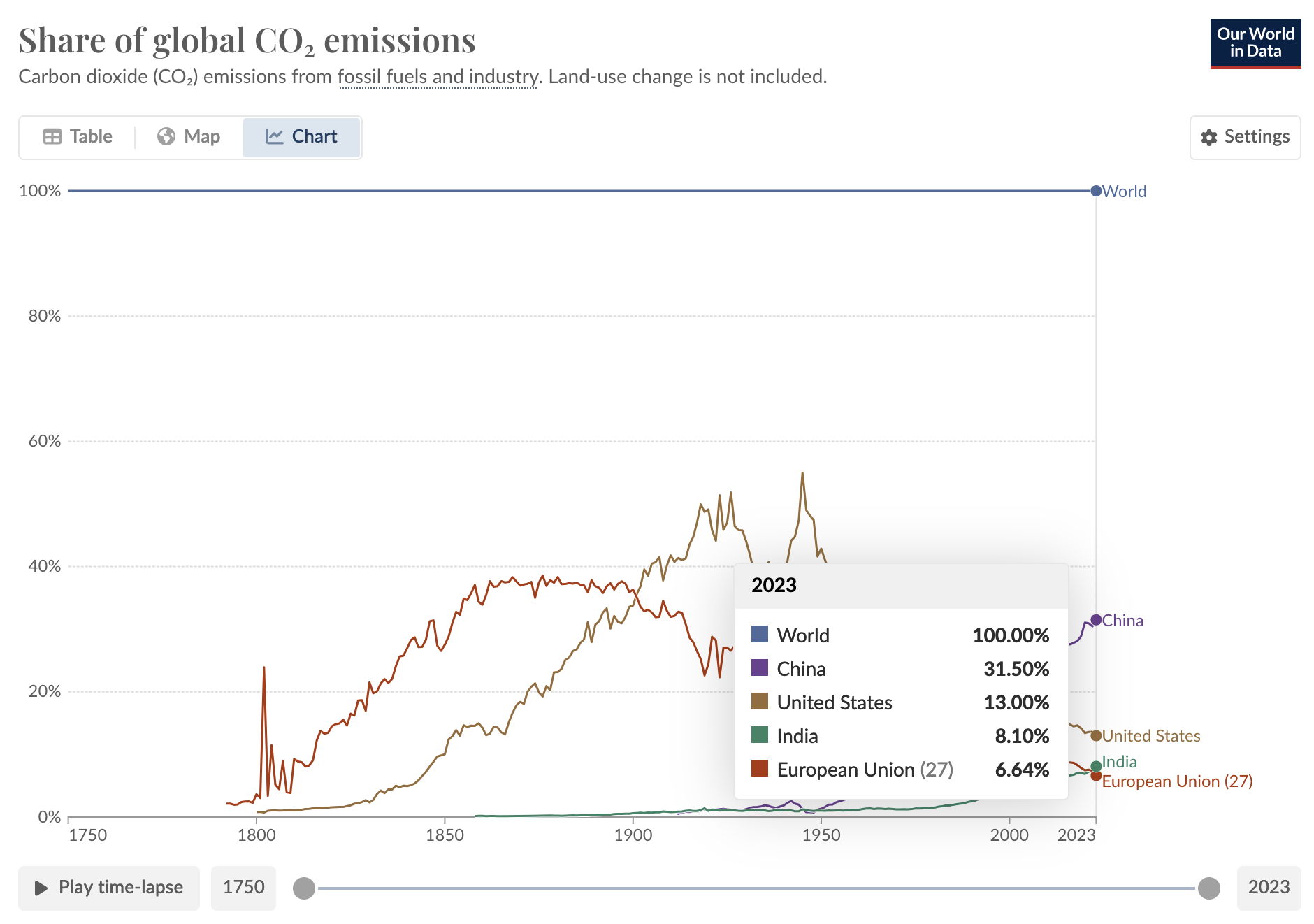 EU in ZDA sta med 2010 in 2023 znižali svoj skupni delež v globalnih CO2 izpustih za 7.7 odst. točk, Kitajska in indija pa sta ga povečali za 8.7 odst. točk. Kitajski delež se je povečal iz 25 na 31.5 %.