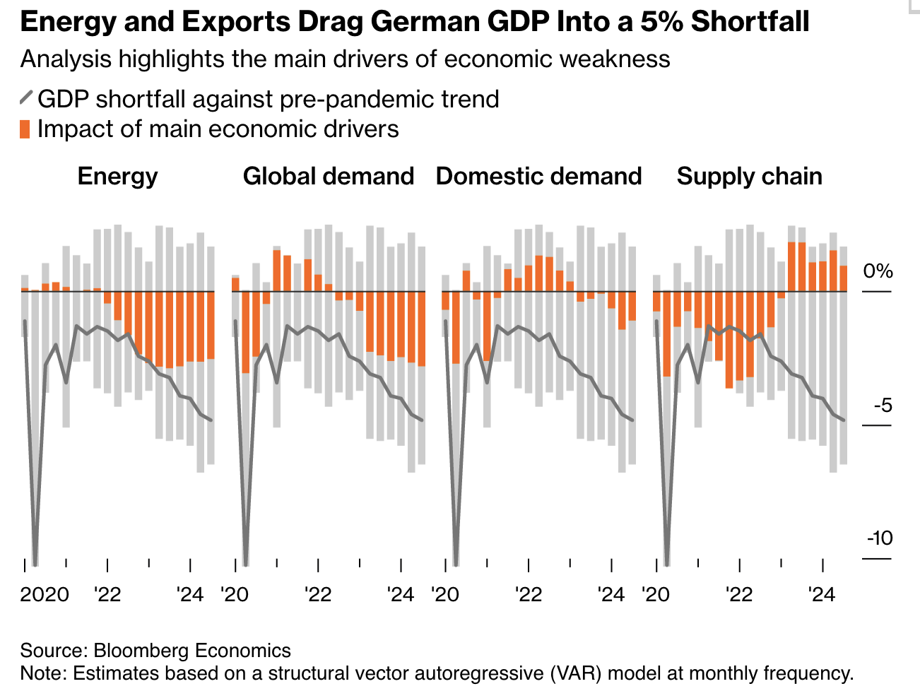 What that looks like is Germany losing more of its energy-intensive manufacturing and exports sliding as unsettled companies rein in domestic investment. As living standards erode, voters cast around for someone to blame, and the social tensions drive away the foreign talent the country desperately needs. The toxic cocktail of caution and resentment would then ripple out across Europe.