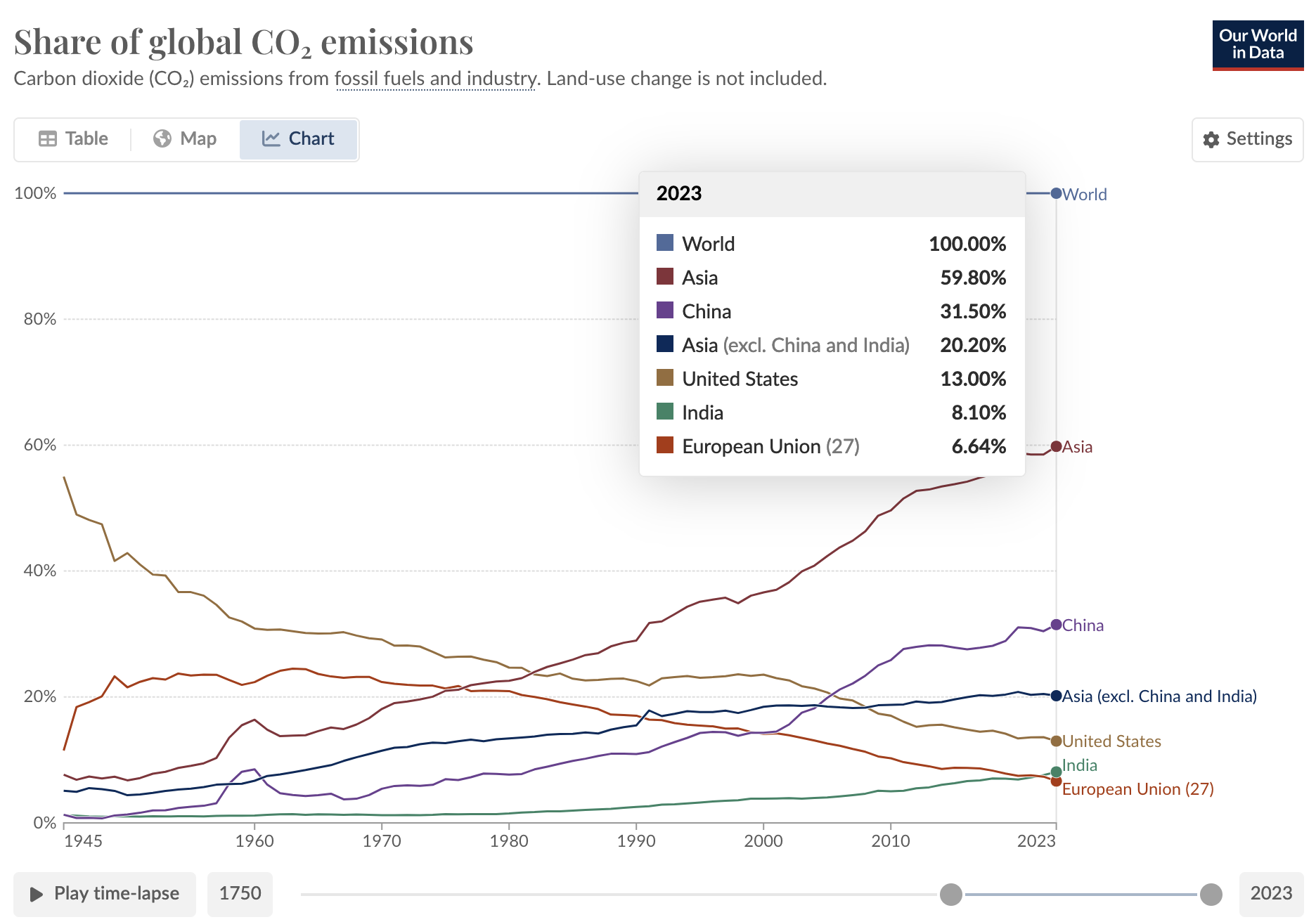 Toda hkrati s tem, ko države EU zaradi višjih cen elektrike (zaradi uporabe nestanovitnih OVE virov sonca in vetra ter posledičnih gigantskih investicij v nekajkratno podvojene kapacitete teh OVE elektrarn, v nadgradnjo omrežja in v hranilnike elektrike ter zaradi trojnega obsega potrebne elektrike za razogljičenje proizvodnje energije, ogrevanja, transporta in industrije), se proizvodnja iz Evrope seli v Azijo (ki trenutno proizvede 59 % vseh globalnih emisij CO2), ki za vsako tono zmanjšanja CO2 izpustov v državah EU doda 12 ton CO2 za proizvodnjo izdelkov, ki bi jih sicer bistveno bolj brezogljično in manj umazano proizvajali v Evropi.