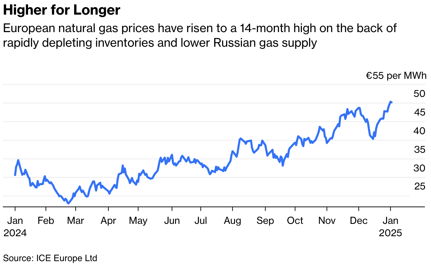 Torej ukrajinsko zaprtje tranzita ruskega plina za EU ne bi smel biti problem. Vendar kljub temu je, kot ugotavlja današnji komentar v Bloombergu. Prvi razlog je vpliv zmanjšanja ponudbe plina na borzne cene plina. Če so cene plina na nizozemski TTF lani januarja znašale med 25 in 30 eur za MWh, so se v pričakovanju ukrajinskega zaprtja tranzita plina konec lanskega leta podvojile na zdajšnjih 50 eur/MWh. Torej sprotne nabave plina v času kurilne sezone so dvakrat dražje.