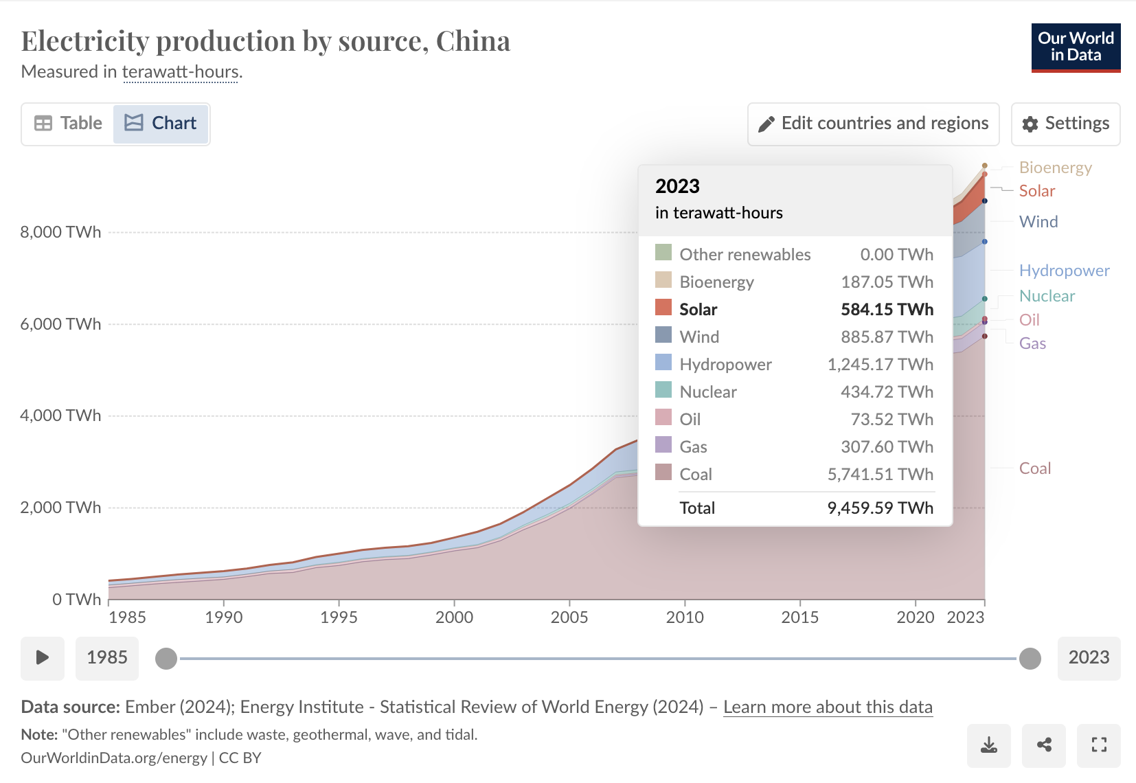 Ko se veselimo dosežka, da bo Kitajska letos prodala več električnih avtov od bencinskih/dizelskih, se moramo predvsem vprašati ali je to res dosežek, če pa “gorivo” za te e-avte ni prav nič zeleno. Kitajska večino (61 %) elektrike pridobi iz premoga. Le 15 % elektrike je iz sonca in vetra, 13 % iz hidro in 4.6 % iz jedrskih elektrarn (glejte spodnjo sliko).