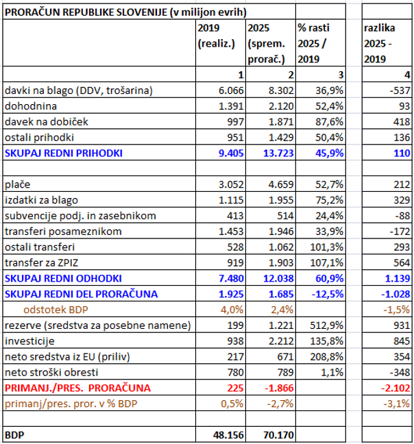 Najbolj ključna informacija glede sprejetih proračunov je seveda vprašanje, kje in na kakšen način bomo potrošili tako velika sredstva ali še bolj natančno – kaj je razlog, da bo proračunski primanjkljaj naslednje leto kar okoli 2 milijardi evrov višji kot leta 2019, ko smo imeli celo 225 milijonov eur presežkov? Odgovor lahko vidimo v priloženi tabeli, v kateri smo proračunske podatke nekoliko preračunali in porazdelili. V prvih dveh kolonah so nominalni podatki za proračun leta 2019 in načrt 2025 z odstotki rasti posameznih postavk. Te pa smo razdelili na “redne” (davki, plače, transferji…), ter tiste, kjer ima država več prostora za ukrepanje (predvsem investicije in z njimi povezanimi sredstvi iz EU ter rezervacije). Ti podatki kažejo, da smo imeli v letu 2019 presežek v višini 0,5 % BDP, naslednje leto pa primanjkljaj v višini 2,7 % BDP (višina BDP posameznega leta je na koncu tabele).