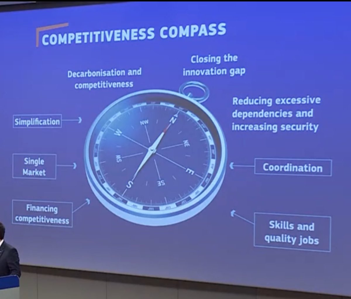 Nenagradno vprašanje: Kako paše kompas v to zgodbo glede evropske konkurenčnosti? Če kompas kot pravo smer kaže zapiranje inovacijske vrzeli, se je torej treba odpovedati vsem podpornim mehanizmom (od poenostavitev do koordinacije)? In če je prava smer zapiranje inovacijske vrzeli, se je torej treba odpovedati ciljema razogljičenja in varnosti?