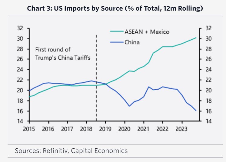 Kitajska je svojo “Trumpovo strategijo” zastavila že v prvem Trumpovem mandatu in preusmerila precejšen delež svojega neposrednega izvoza v ZDA posredno preko ASEAN držav (predvsem Vietnama) in Mehike. Spodnja slika kaže, da se je delež ZDA v kitajskem izvozu med 2018 in 2024 zmanjšal iz 19 % na dobrih 14 %, medtem ko se je delež izvoza v države ASEAN + Mehiko povečal iz 14 na 18 %…