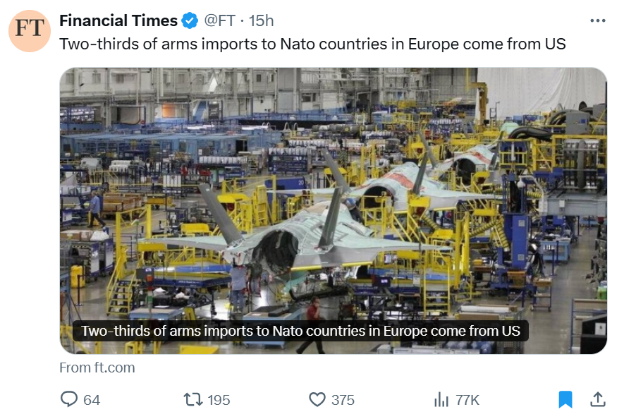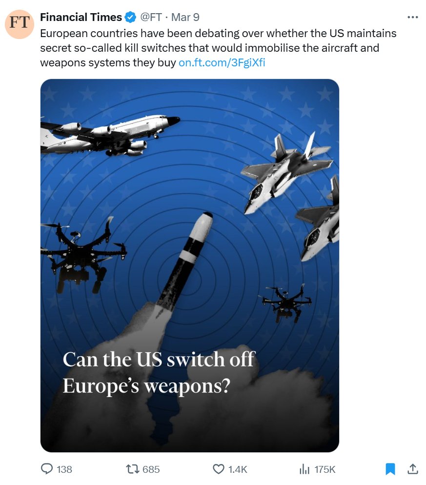 Evropska politična elita se je ujela v past svoje najnovejše obsesije – orožarske histerije. Nenadoma je ugotovila, da dve tretjini vsega orožja kupi v ZDA, preostanek do treh četrtin vseh nakupov orožja in opreme pa večinoma v Izraelu. Nenadoma je ugotovila, da imajo ta napredna orožja, kot so denimo ameriški lovci F-35, lahko “gumbe” (“kill switch”), ki onesposobijo delovanje teh letal. Podobno je s programsko opremo drugega orožja, z GPS-om itd. Torej, evropske države se bodo lahko bojevale samo v vojnah, ki jih bodo odobrile ZDA.