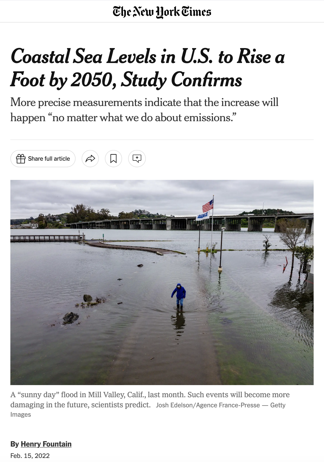 No, dve leti pred tem pa so znanstveniki v ZDA in za njimi ameriški vladni uradniki znova zagnali preplah, da se bo gladina vode na ameriških obalah do leta 2050 dvignila za en čevelj (33 cm). New York Times (12.2.2022):