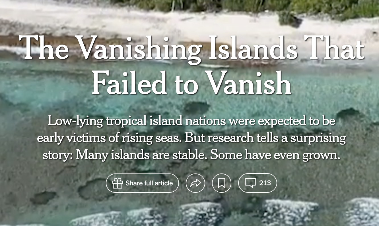 And indeed, when the world began paying attention to global warming decades ago, these islands, which form atop coral reefs in clusters called atolls, were quickly identified as some of the first places climate change might ravage in their entirety. As the ice caps melted and the seas crept higher, these accidents of geologic history were bound to be corrected and the tiny islands returned to watery oblivion, probably in this century.