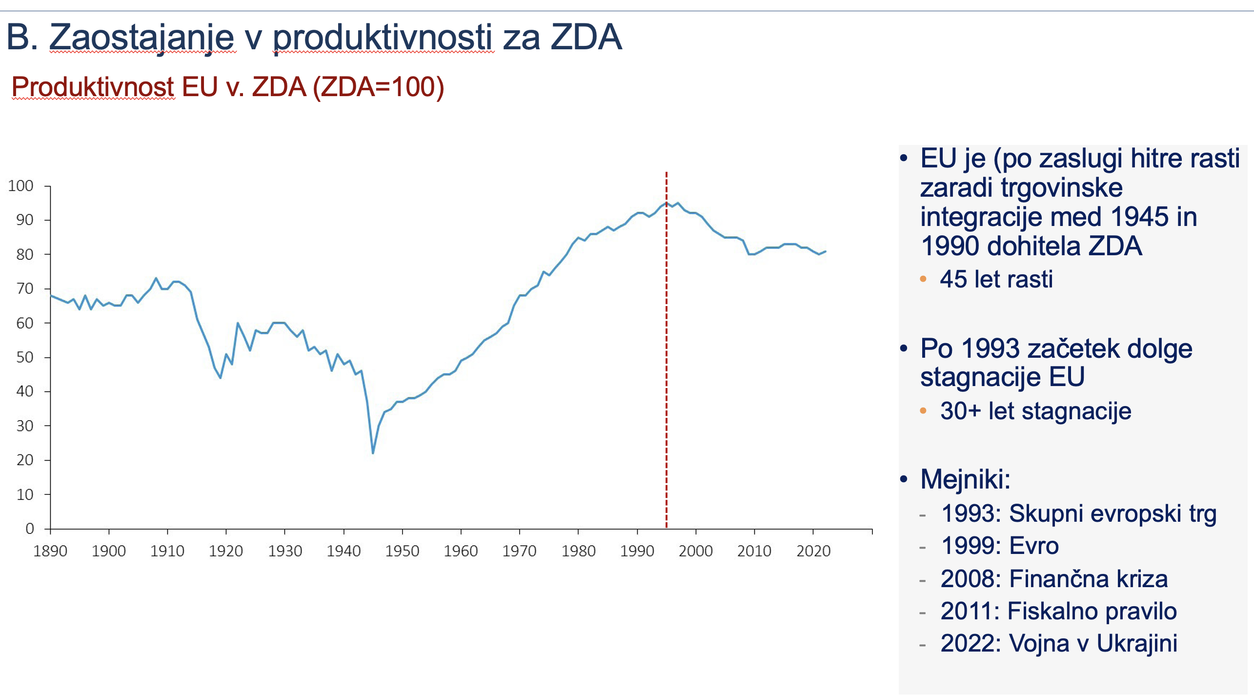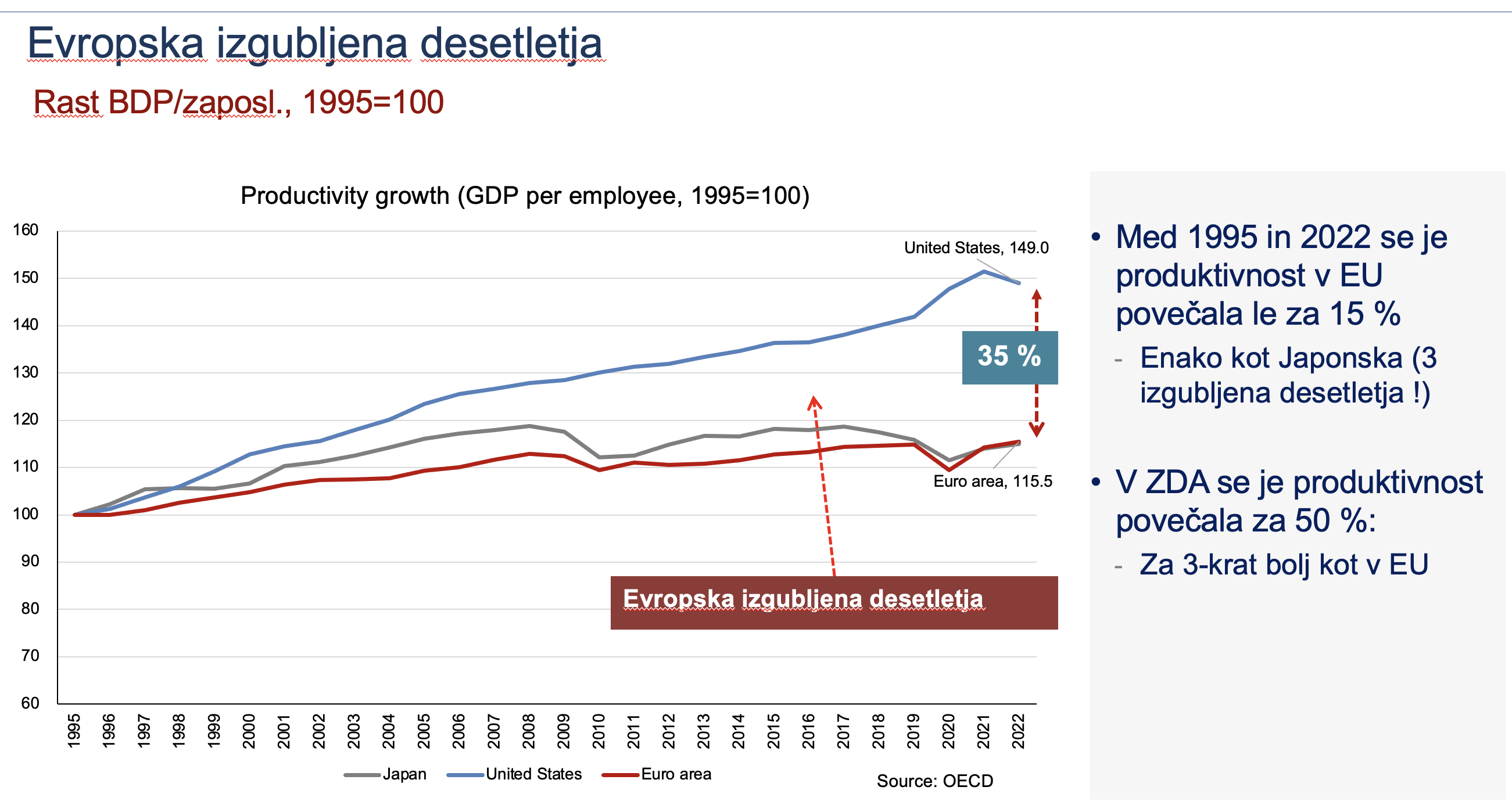- Prvič, v manj kot 30 letih so države EU glede produktivnosti za 35 % zaostale za ameriško rastjo produktivnosti.