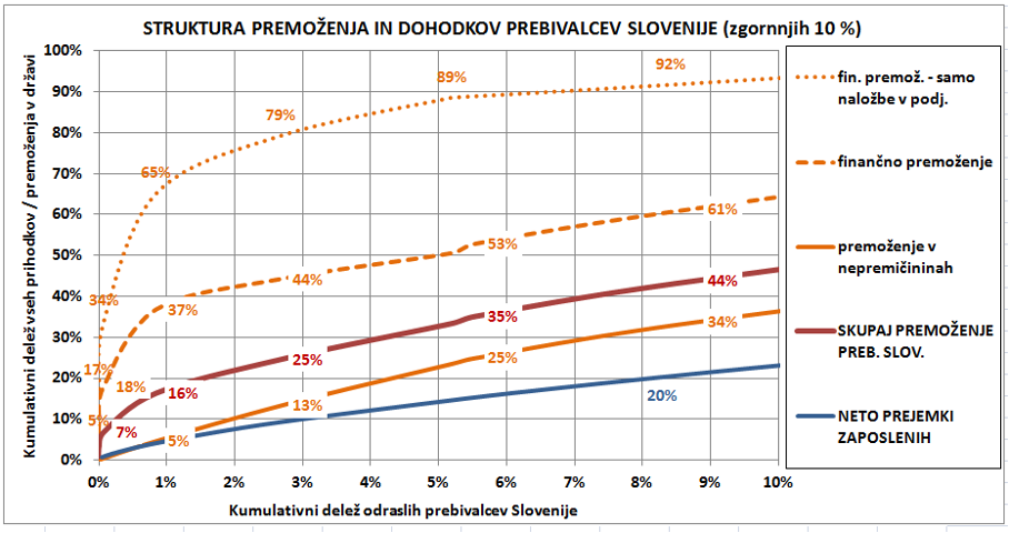 Vendar bomo ostali na odraslih prebivalcih in strukture v tabeli se nanašajo nanje, čeprav imamo pogoste primere, da ima premoženje uradno samo en zakonec, čeprav je to premoženje cele družine. Iz slike lahko razberemo, da ima 20 % odraslih prebivalcev približno 64 % vsega premoženja ter okoli 55 % celotne vrednosti nepremičnin. Nepremičnine so namreč bistveno bolj enakomerno razpršene med prebivalstvom, saj ima kar okoli 80 % družin lastni objekt za bivanje. Če pa pogledamo premoženje prvih 50 % odraslih prebivalcev, pa imajo ti skoraj 90 % celotne vrednosti nepremičnin v državi. Finančno premoženje pa je bolj koncentrirano in petina odraslih ima v rokah kar okoli 80 % vsega finančnega premoženja. V okviru celotnega finančnega premoženja je še večja koncentracija pri lastništvu podjetij. Desetina prebivalcev ima preko 90 % vse vrednosti vložene v podjetja, že 3 odstotke prebivalcev (45 tisoč ljudi) pa okoli 80 % tega premoženja, kot je podrobneje prikazano na drugi sliki za zgornjih deset odstotkov najpremožnejših.