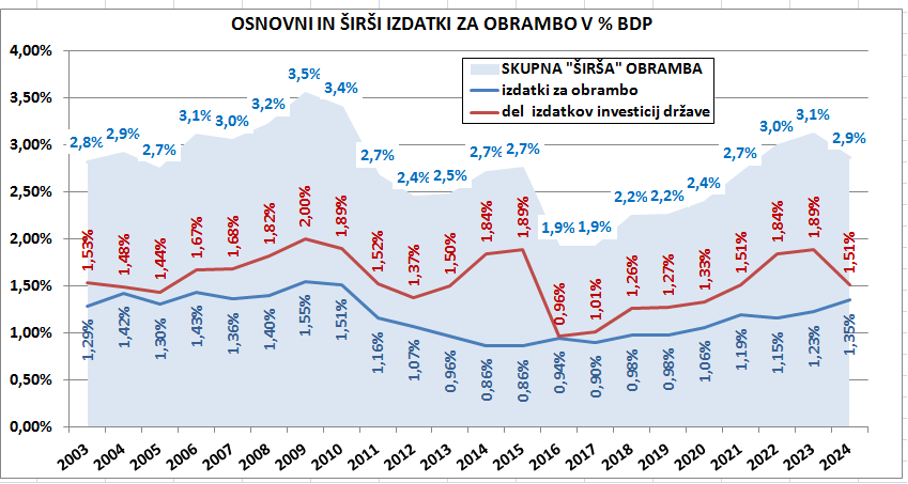 Če namreč sledimo tej logiki, da pomemben del naložb države predstavlja vlaganja v širše razumljeno varnost, potem smo že do sedaj za širše razumljeno obrambo namenjali bistveno več kot omenjeno uradnih 1,2 % obrambnih izdatkov v zadnjih letih. Na prvi sliki je z modro črto predstavljen odstotek proračuna za obrambo kot ga spremlja uradna statistika in ta se je nekdaj gibal okoli 1,4 % BDP, nato se je vrtel okoli odstotka in lani prišel na 1,35 % BDP. Če bi k temu prišteli na primer polovico vseh državnih investicij v teh letih (rdeča črta), so se “širši obrambni izdatki” gibali kar med 2 in 3 odstotke BDP. Skoraj toliko kot ZDA in več kot so znašale zaveze do Nata! Če danes gledamo varnost v širšem smislu, to velja tudi za preteklost.