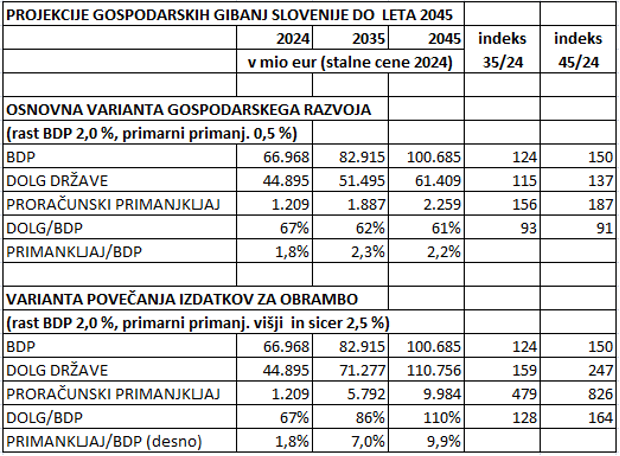 Kakšen bi bil ob takšnih gibanjih BDP države Slovenije po cenah 2024 in kakšen javni dolg čez deset in čez dvajset let je prikazano v tabeli. Po osnovni varianti bi bil BDP ob navedenih predpostavkah leta 2035 realno za 24 % višji, višji bi bil tudi dolg, a realno glede na BDP nižji. Iz današnjih 67 % BDP bi upadel na 62 %. V letu 2045 bi bile številke višje, a primerjalno s podobnimi trendi. S takšnimi gibanji bi seveda presegli današnje povprečje EU na prebivalca, a vmes bodo rasle tudi druge države in za povprečjem bomo še vedno zaostajali, čeprav (vsaj upamo) manj.