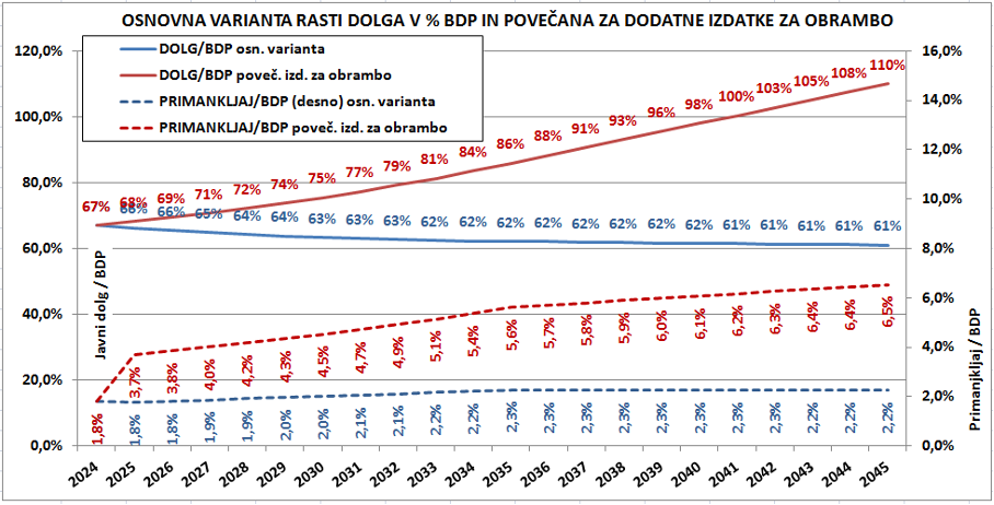 Poskušali smo okvirno oceniti, kako bi zvišanje obrambnih izdatkov vplivalo na finančni položaj države v naslednjih desetih, dvajsetih letih. Seveda ne vemo, kakšna bodo gospodarska gibanja v naslednjih desetletjih, a zanimalo nas je, kako bi povečanje teh izdatkov spremenilo finančno sliko države, če teh povečanj ne bi bilo. Za izhodiščno, osnovno varianto smo predpostavili, da bi BDP Slovenije tudi v naslednjih letih rasel po približno 2 % realni stopnji kot do sedaj, da bi imeli konstantno 0,5 % primarnega proračunskega primanjkljaja, z obrestmi danes okoli 2 % BDP skupnega primanjkljaja ter da se bo obrestna mera na državni dolg postopno povišala iz današnje 2 na 3 odstotke letno. Letna inflacija naj bi bila 2 %. To so dokaj realne in tudi dosegljive predpostavke ob nekih normalnih razmerah v svetu. Podobno kot smo pravzaprav dosegali tudi zadnjih 20, 30 let.