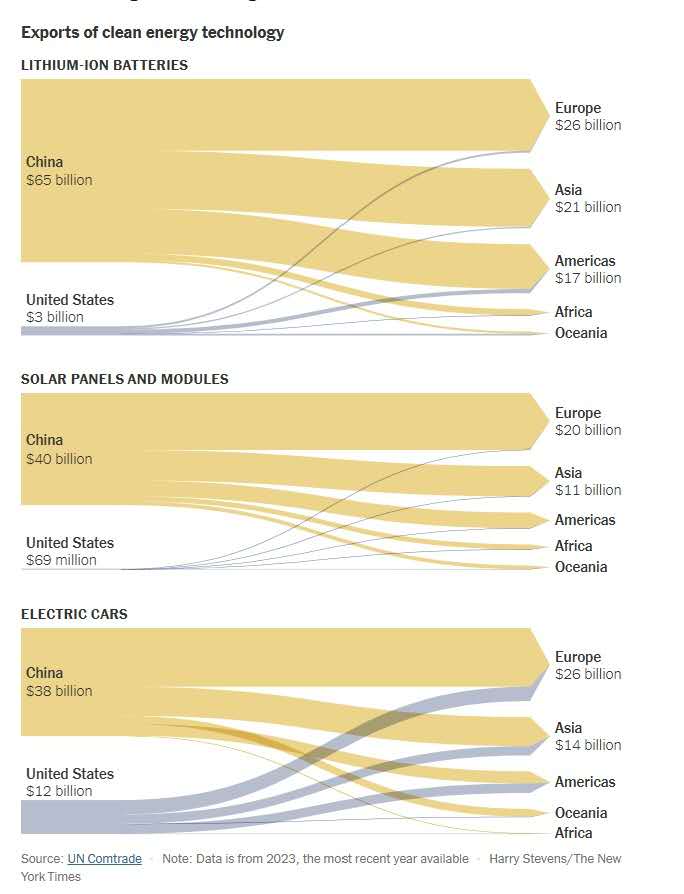 Tole spodaj je resnično dober graf iz New York Timesa, ki kaže diametralno različne strategije ZDA in Kitajske glede investicij v tehnologije za proizvodnjo elektrike in tehnologij za uporabo elektrike namesto fosilnih goriv (baterije, EV). Katera strategija bo zmagovalna v tej tekmi?