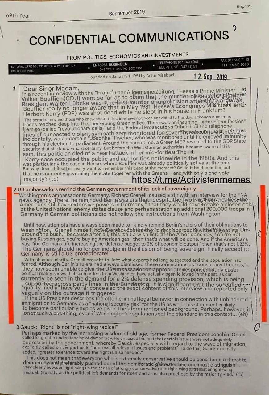 Ameriški veleposlanik v Nemčiji Richard Grenell je pred leti poskrbel za dvig prahu, ko je Nemce spomnil, da Nemčija ni suverena država, pač pa je še vedno protektorat Amerike. Kar v besedah Grenella pomeni: