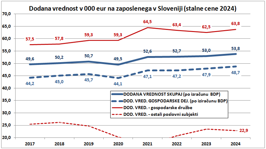 Drug pomemben podatek pa je vsebina tega kazalca. Kadar podatke o dodani vrednosti na zaposlenega navaja Gospodarska zbornica Slovenije (GZS) ali Ministrstvo za gospodarstvo, imajo v mislih dodano vrednost ustvarjeno v gospodarskih družbah. AJPES ločeno zbira podatke o poslovanju vseh gospodarskih družb v Sloveniji. Teh je bilo lani 77 tisoč in so ustvarile preko 90 % dodane vrednosti celotnega gospodarstva kot podatke zbira ta institucija. Preostalo dodano vrednost ustvarjajo samostojni podjetniki in drugi poslovni subjekti katerih skupno število vključno s podjetji je preko 240 tisoč. Povprečna dodana vrednost na zaposlenega v gospodarskih družbah je lani znašala 63,8 tisoč eur in to je podatek, ki se najpogosteje uporablja pri določanju ciljev in spremljanju dosežkov.