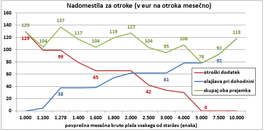 Na bodoravni osi slike so navedene različne višine mesečne bruto plače vsakega od staršev (kot da prejemata oba enako plačo) in sicer začenši s 1.000 eur, nato tudi primer z minimalno plačo (1.278 eur bruto mesečno), zatem pa še različne višine plač vse do variante z bruto mesečno plačo v višini 10 tisoč eur. Z rdečo črto je torej navedena višina otroškega dodatka za enega otroka, ki ga prejema družina glede višino dohodkov. Trend je seveda pričakovan. Pri dveh minimalnih plačah, prejme družina 99 evra povprečno za enega otroka mesečno, pri 4 tisoč eur bruto plače mesečno 30 eur, pri višjih prejemkih pa družina nima upravičenja do otroškega dodatka.