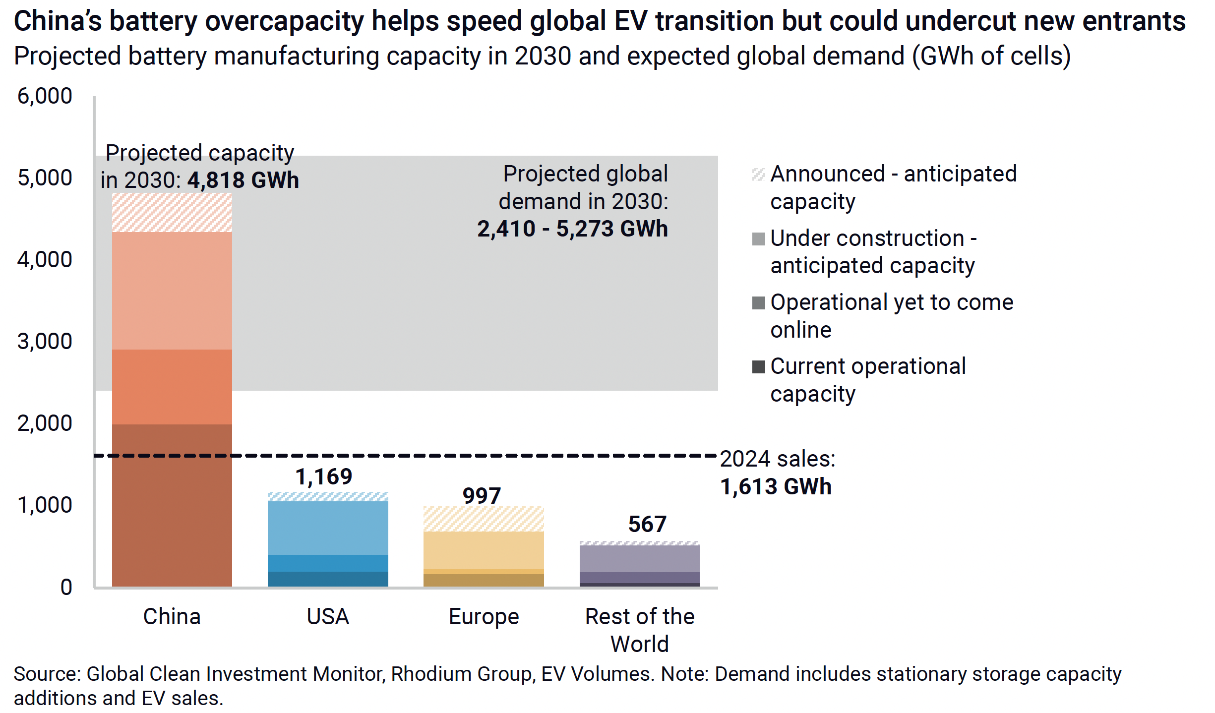 In s prestrukturiranjem v smeri proizvodnje EV, se problem še poglablja. Spodnja slika kaže, da so kitajska podjetja povsem saturirala trg baterij za EV. Že zdaj, ko imajo 70 % tržni delež, so s kapaciteto na 120 % sedanje prodaje. Leta 2030 naj bi se zahodna podjetja približala, vendar pa v spodnjih projekcijah ni upoštevano, ali bodo zahodna podjetja sploh lahko konkurirala ob tako nizkih cenah in ali ne gre samo za pobožne investicijske načrte.