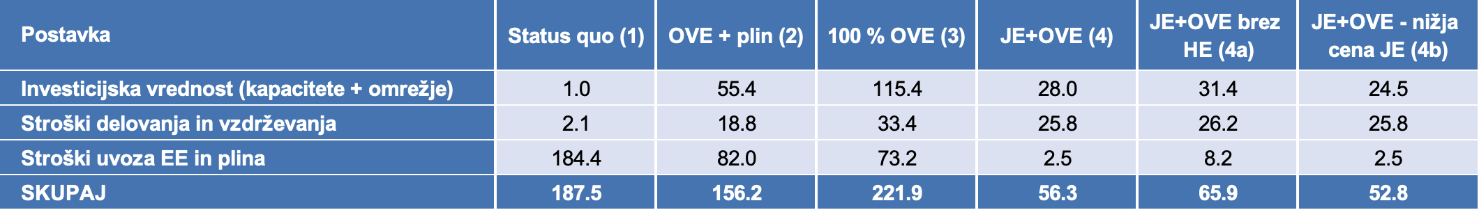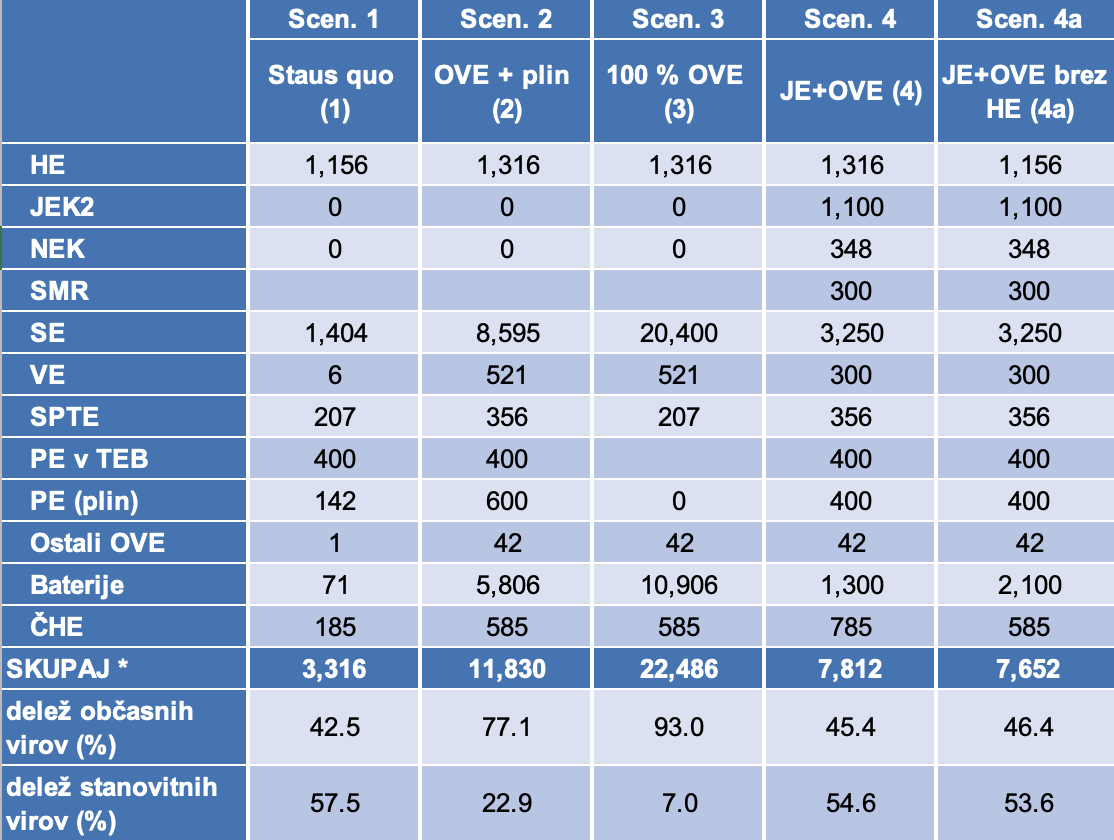 - Scenarij 3: 100 % OVE (zaprtje NEK, zgolj naložbe v OVE),