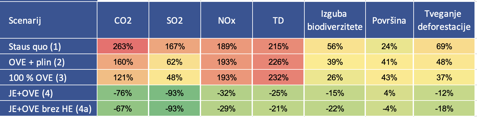 Po izpustih (CO₂ in drugi TPG ter trdi delci), rabi prostora, vplivu na biodiverziteto in tveganju deforestacije sta oba JE+OVE scenarija najbolj primerna; razlike med obema so majhne. Pri čemer je vključitev novih HE okoljsko bolj ustrezna iz vidika izpustov TPG in trdih delcev, podscenarij brez novih HE pa je okoljsko bolj ustrezen iz vidika rabe prostora, vpliva na biodiverziteto in tveganja deforestacije. Tretji scenarij je 100 % OVE, sledi OVE+plin; najslabši je Status quo. Vsi trije scenariji prek uvoza pretežno ogljično-intenzivne elektrike prenašajo negativne okoljske vplive v tujino.