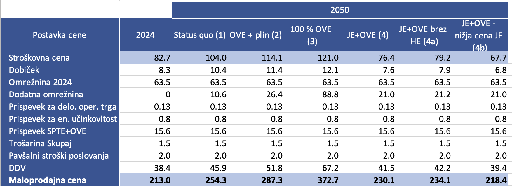 Tudi glede maloprodajnih cen (MPC), ki upoštevajo višje stroške omrežnine ter vse prispevke in dajatve, je JE+OVE scenarij najbolj ugoden: ob osnovnih predpostavkah bi MPC do 2050 narasla le za 8 % glede na 2024 (po stalnih cenah iz 2024). Nasprotno bi MPC v OVE+plin scenariju zrasla za 35 %, v 100 % OVE scenariju pa za 74 %. Ob visokih uvoznih cenah (160 EUR/MWh) se MPC v 100 % OVE scenariju do 2050 približa 400 EUR/MWh, medtem ko MPC v JE+OVE scenariju po 2040 ostane stabilna zaradi avtonomije.