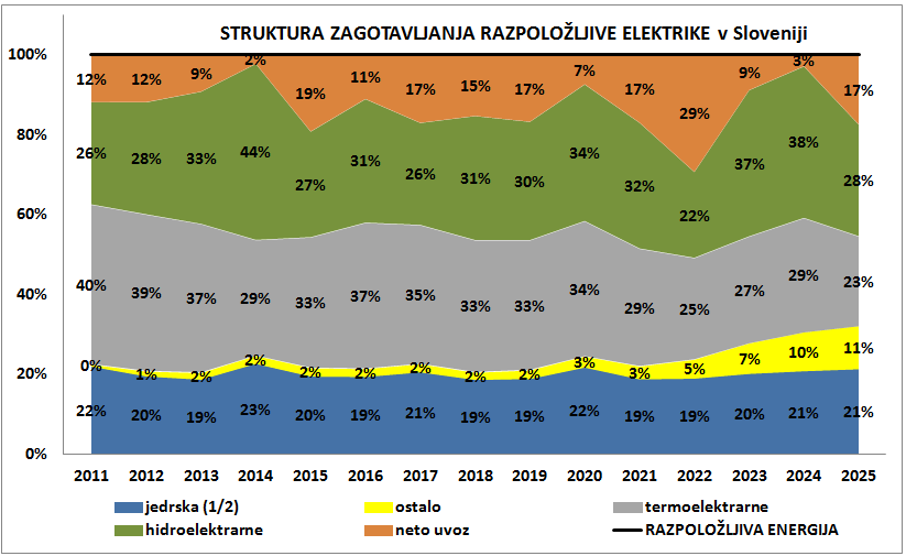 Slika prikazuje stabilno proizvodnjo Nuklearke Krško, pri čemer je v izračun vključen samo slovenski del proizvodnje (polovico jo prevzema Hrvaška). Ključna sprememba v zadnjih letih je povečanje deleža sončne energije na letošnjih okoli 11 %. Termoelektrarne, v preteklosti pretežno TEŠ, so nekdaj prispevale 40 % vse potrebne elektrike v Sloveniji, nato pa se je delež postopno zniževal na okoli 30 %, letos pa po oceni nekaj nad 20 %. Največji vir elektrike pa so vodne elektrarne, kjer pa proizvodnja niha glede na vodnatost rek. V povprečju prispevajo skoraj tretjino potrebne elektrike, a nihanja med leti so tudi v razmerju 1 proti 2. Po sušnem letu 2022, smo imeli dve bogati leti z vodo, vsaj po občutkih pa preseneča letošnje leto. Letos je bila do oktobra proizvodnja kar 15 % pod dolgoletnim povprečjem ali kar 30 % nižja kot lani. Poleg zmanjšanja proizvodnje v TEŠ je bil to glavni razlog povečanja uvoza na okoli 17 % celotnih potreb. Uvozni del se je sicer večino obravnavanega obdobja gibal okoli 15 %.