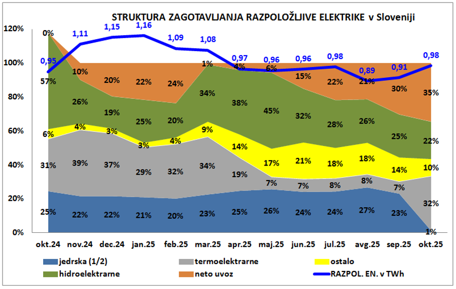 Kot kaže slika, smo prejšnjo zimo potrebno elektriko ob nekaj manjši proizvodnji hidro energije, zagotavljali z večjo proizvodnjo v TEŠ, a še vedno četrtinskim uvozom. Letošnje poletje smo zaradi povečane solarne proizvodnje TEŠ ustavili, a vseeno morali uvažati kako petino elektrike. Prvi letošnji hladnejši mesec oktober pa je šla nuklearka v remont (praviloma enkrat na leto in pol), delež sončne je že padel na 10 % in če ne bi ponovno zagnali TEŠ, bi bili uvozno odvisni preko 60-odstotno. Razlog je bil tudi v hidro razmerah, saj smo iz vode proizvedli kar 2,5-krat manj elektrike kot lani isti mesec, ko smo ob istočasnem delovanju TEŠ in NEK imeli celo presežke elektrike.