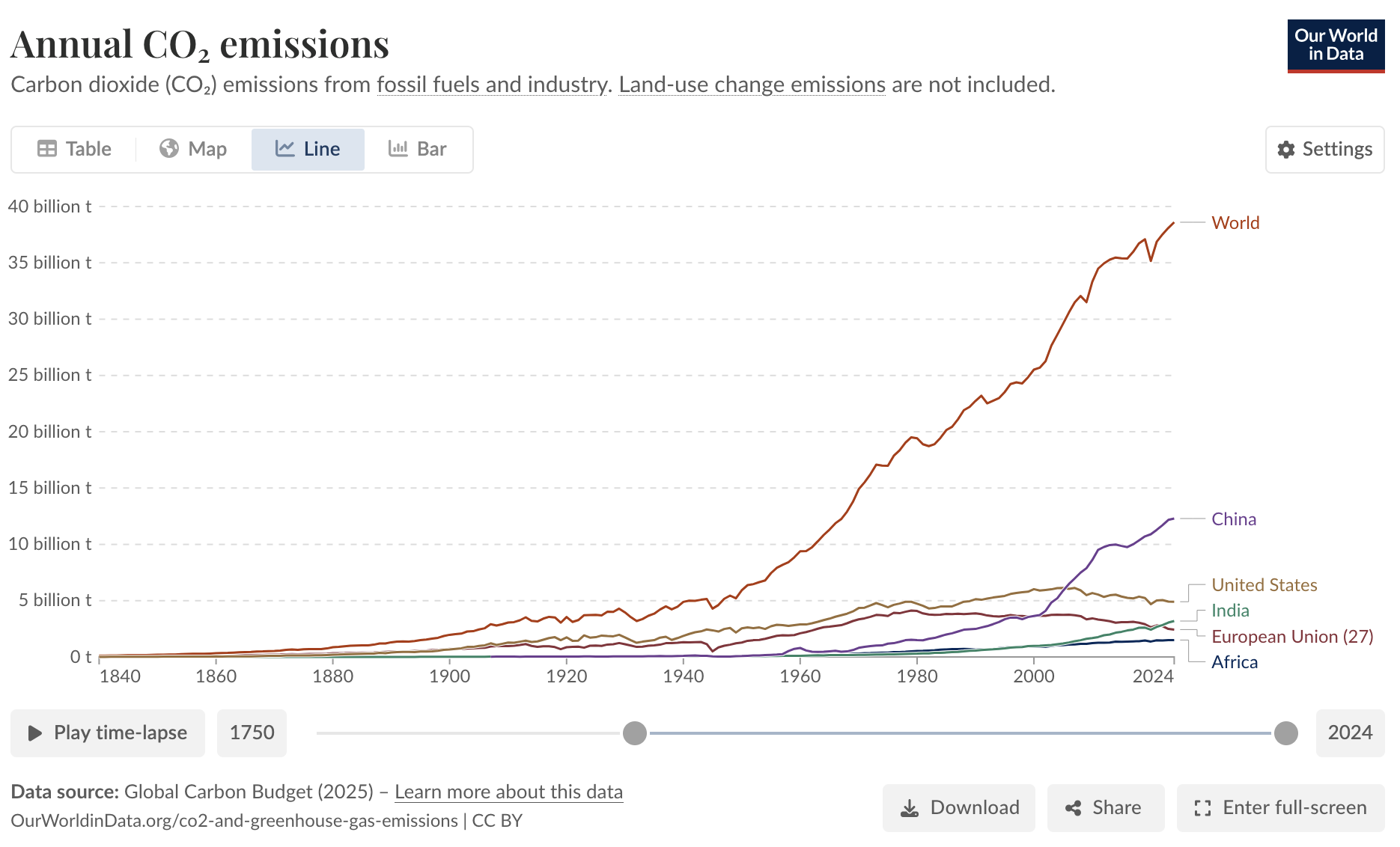 EU torej s svojimi podnebnimi politikami globalnega podnebja ne rešuje – pač pa le izvaža emisije. Graf ogljične intenzivnosti na enoto BDP kaže, da EU za vsak dolar ustvarjenega BDPv ozračje izpusti 0,16 kg CO₂, Kitajska pa 0,43 kg CO₂ – torej je kitajski proizvodni model 2,7-krat bolj ogljično intenziven oziroma približno 170 % bolj umazan od evropskega. Azija kot celota ima intenzivnost 0,33 kg CO₂/$, kar je 2,1-krat več kot EU (≈106 % višje emisije na enoto BDP).