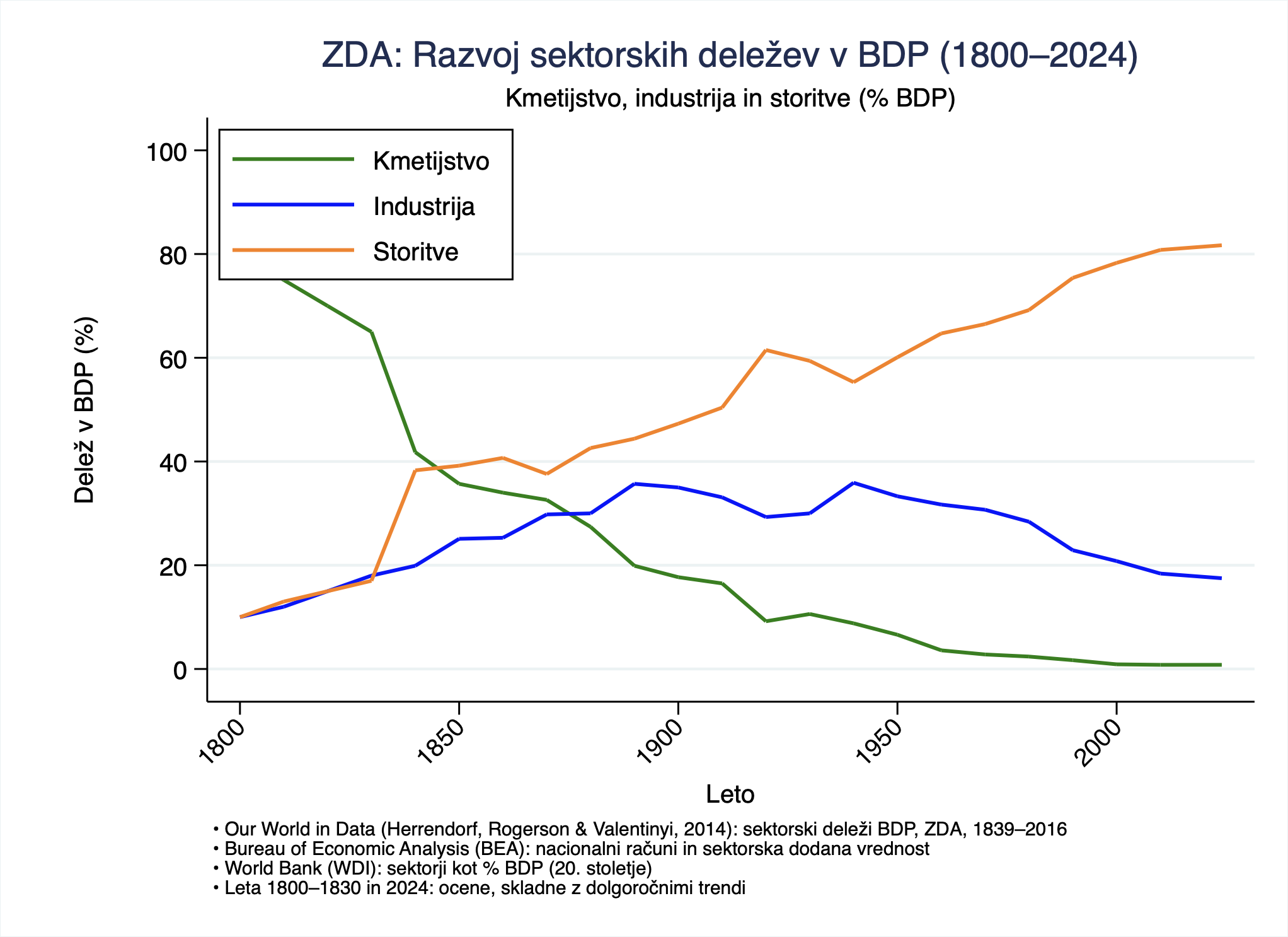 Toda to je preprosto posledica normalnega toka razvoja. Pred 200 leti je močno prevladoval delež kmetijstva, nato je začela prevladovati industrija, katere delež je dosegel vrh okrog leta 1950, od takrat pa se krepi delež storitev, ki se danes približuje 80 % BDP, medtem ko je delež kmetijstva le okrog 1 %. Deleža kmetijstva in industrije determinira predvsem produktivnost – s hitro rastjo produktivnosti lahko danes kmetijstvo z 1 % BDP in industrija s 15-20 % BDP ustvarita dovoljšnje količine hrane in dobrine, kolikor jih potrebujemo.