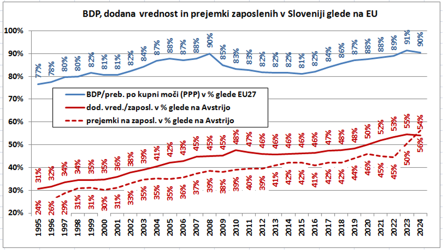 Na žalost pa je to zadnje področje ključno za našo bodočo gospodarsko in tudi siceršnjo sliko države, vključno z nivojem življenjskega standarda ljudi. S kakšno spremembo davčne stopnje seveda lahko dvignemo neto plačo v breme proračuna, a ključne dileme so drugje. Povprečna dodana vrednost v letu 2024 v industriji je bila v Avstriji 110 tisoč eur na zaposlenega ali 78 % več kot v Sloveniji. In edino to je omogočilo, da je bil v Avstriji povprečni mesečni prejemek zaposlenega v industriji 5.800 eur ali 85 % več kot pri nas, ki je znašal 3.150 eur na zaposlenega (navedene številke so podatki o sredstvih za plače v strukturi BDP). Razprave ali je od slovenskih 3.150 eur prejemka namenimo 50 eur več ali manj za davke seveda ne rešujejo ključne razlike, da znajo v Avstriji zaslužiti skoraj enkrat več in potem lahko tudi več namenijo zaposlenim. Vsi bodoči ukrepi vlade bi morali seveda slediti predvsem temu cilju.