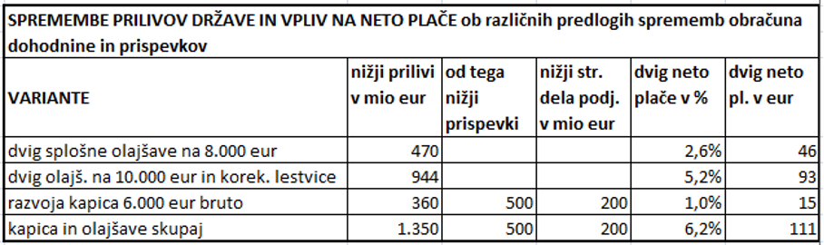 Ocene finančnih učinkov teh sprememb na proračun ter na povprečne neto plače so prikazane v tabeli, za plače pa še dodatno v dveh slikah glede na višino plač. Dvig splošne olajšave na 8.000 eur bi predvidoma zmanjšal prilive v proračun za skoraj pol milijarde evrov, kar bi dvignilo neto plače za približno 2,6 %. Dvig olajšave na 10 tisoč eur ter še predlagane korekcije dohodninske lestvice z ukinitvijo najvišje stopnje, pa bi pomenil skoraj milijardo izpada v proračunu in dvig neto plač za 5 %. Ti predlogi bi torej izboljšali položaj zaposlenih, stroški plač za podjetja pa bi pravzaprav ostali enaki.