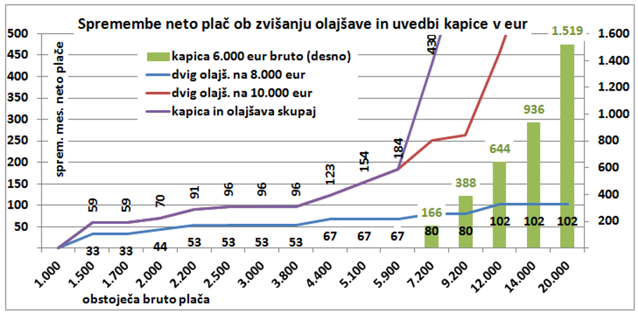 Konkretni predlogi gredo v smeri zvišanja splošne olajšave na 8.000 eur (danes je 5.550 eur), kot drugo opcijo smo upoštevali dvig te olajšave na 10.000 eur z dodatnimi korekcijami dohodninskih stopenj. Naslednji predlog je v uvedbi razvojne kapice, torej zgornjega zneska plačevanja socialnih prejemkov. V četrti opciji pa smo pogledali še učinke obeh zadnjih dveh ukrepov skupaj.