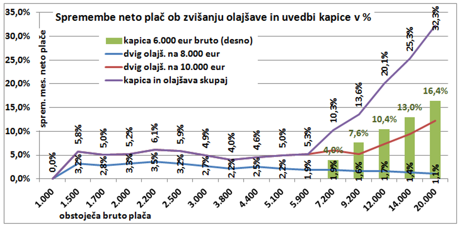 Navedeni podatki se nanašajo na učinke na povprečno plačo, v spodnjih dveh slikah pa so še učinki za posameznika, kjer pa bo slika mogoče že malo manj všečna za veliko število ljudi. Na prvi sliki so učinki v eur mesečno na zaposlenega z bruto plačo kot je navedena na spodnji osi slike. Po prvi varianti z 8 tisoč eur olajšave, bi nekdo s 1.500 eur bruto mesečne plače dobil na mesec 33 eur več, po drugi varianti pa 59 eur. Kot kaže druga slika bi to pomenilo okoli 5 % višja neto plača. Približno ta odstotek bi veljal za vse zaposlene do 6.000 eur bruto plače, le da bi se znesek dvignil do 180 eur mesečno za bolje plačane. Tu je potrebno dodati, da pač olajšava 10 tisoč eur pomeni mesečno precej večje učinke pri visoko plačanih zaposlenih kot pri nekomu z minimalno plačo, ki danes dohodnine sploh ne plača in mu potem tudi olajšava nič ne pomeni.