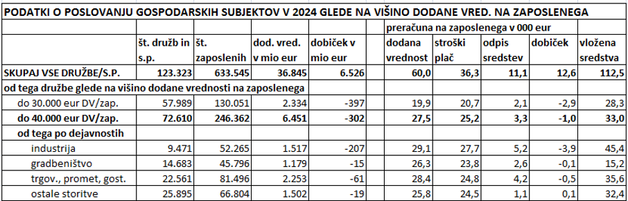 V spodnji tabeli je nekaj podatkov o poslovanju gospodarskih subjektov, ki zajema vse gospodarske družbe ter samostojne podjetnike v letu 2024 (brez normiranih s.p.). Teh subjektov, ki so oddali letna poročila na Ajpes, je bilo skupaj 123 tisoč. Navedeni subjekti so imeli skupaj 633 tisoč zaposlenih. Razlika do okoli milijona zaposlenih v Sloveniji je potem v javnem sektorju (214 tisoč), finančnih dejavnostih (22 tisoč) ter normiranih s.p., kmetih in vseh drugih oblikah zaposlitve. Vse navedene družbe so skupaj ustvarile 36,8 mrd eur dodane vrednosti ali 60 tisoč eur na zaposlenega ter 6,5 mrd eur čistega neto dobička (po davkih in izgubah), kot je prikazano v prvi vrstici tabele. Dodana vrednost je ključen podatek uspešnosti poslovanja ter tudi izračuna celotnega BDP. Iz dodane vrednosti se namreč pokrivajo plače, amortizacija ter stroški obresti, ostanek pa je dobiček za lastnike podjetij.