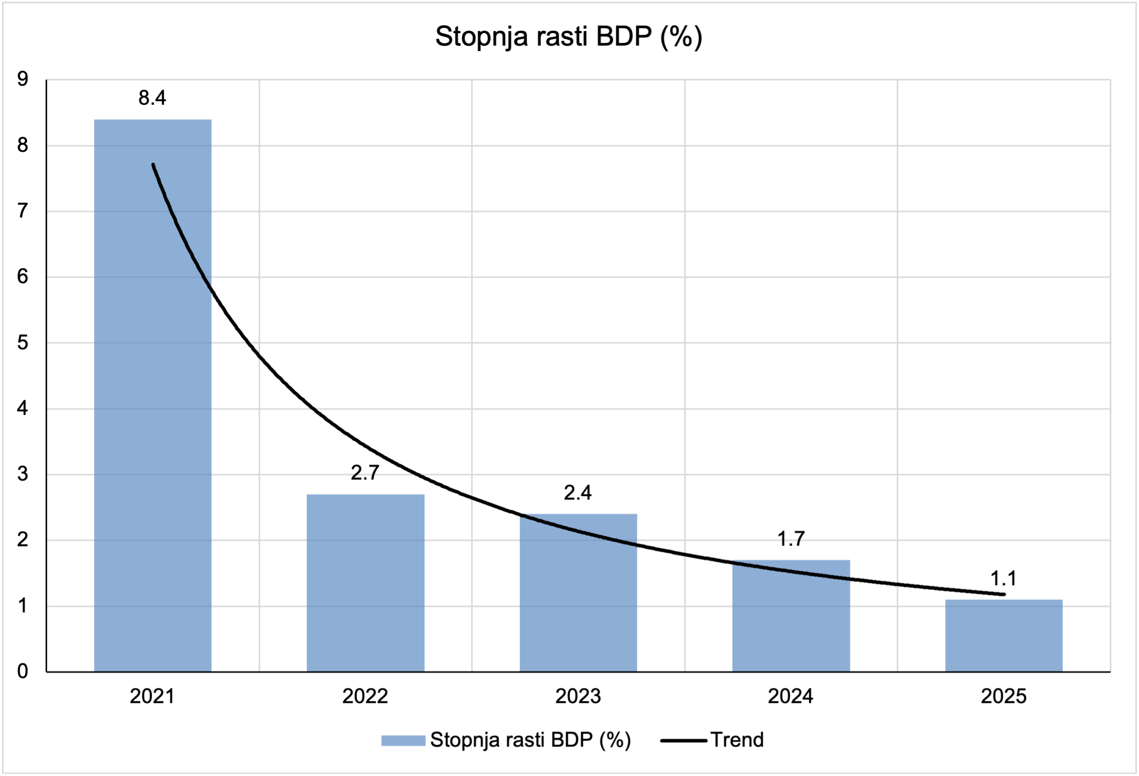 Kot veste, je slovenski BDP v lanskem letu zrasel le za mišjo dlako – za ubornih 1.1 %. Spodnja slika kaže strukturni zlom v dinamiki rasti slovenskega BDP v času Golobove vlade. Po izjemno visoki rasti v letu 2021 v času prejšnje Janševe vlade (8,4 %), se je rast že v letu 2022 zrušila za skoraj dve tretjini, nato pa se je v letih 2023–2025 vztrajno in sistematično ohlajala vse do približno 1 %. Takšen trend kaže na pomanjkanje razvojnega zagona, investicijske negotovosti in odsotnost proaktivne ekonomske politike, ki bi v času ugodnih javnofinančnih izhodišč blažila upad. Namesto uporabe fiskalnega prostora za dvig produktivnosti, pospešitev investicij in krepitev konkurenčnosti, smo bili priča postopnemu drsenju v režim nizke rasti – stagnacije, kar dolgoročno ogroža dohitevanje razvitejših držav EU in vzdržnost socialne države.