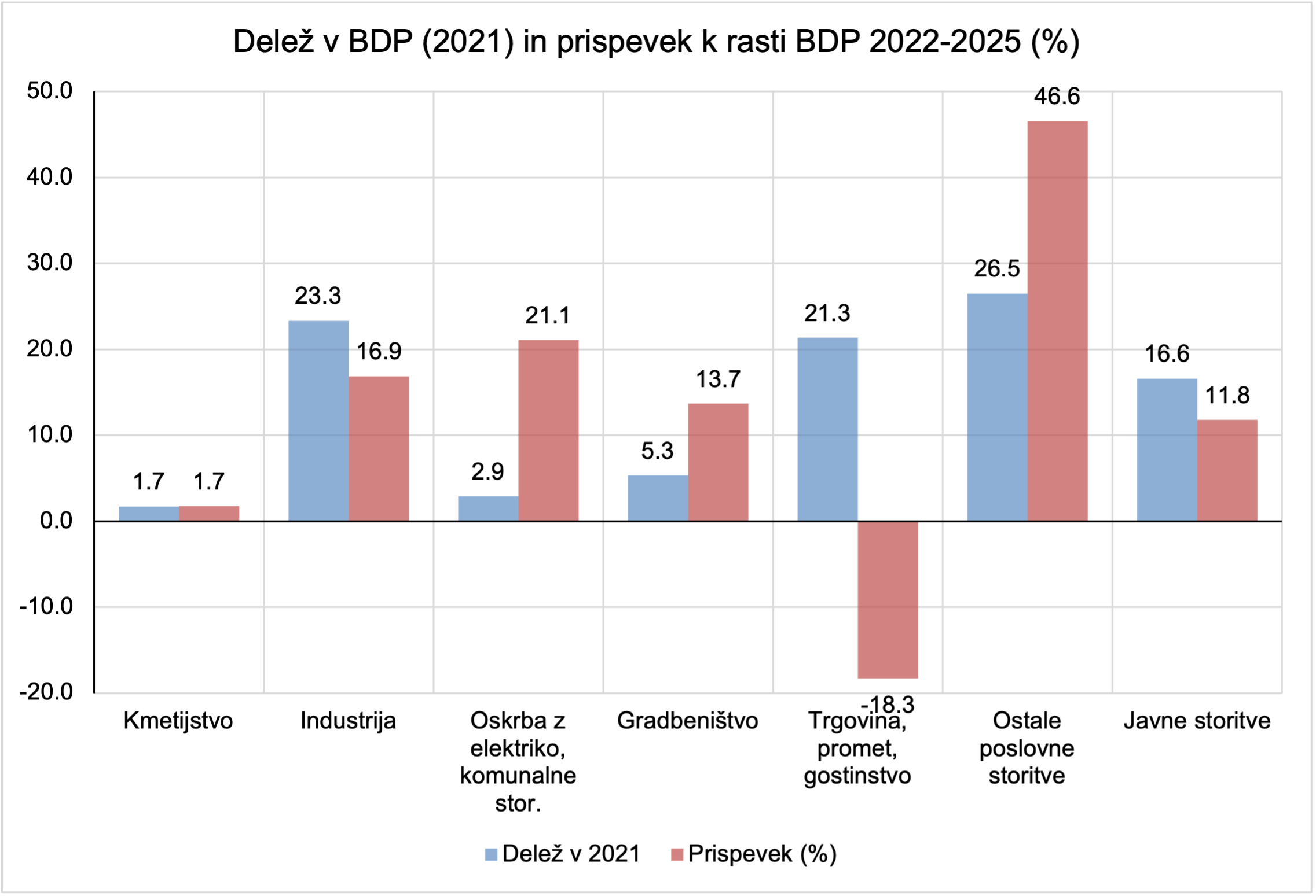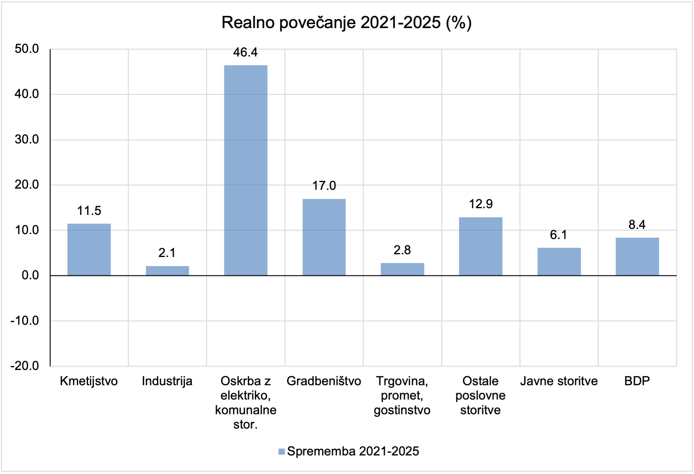 Gradbeništvo je realno zraslo za 17 %, kar kaže, da so tekli investicijski cikli (infrastruktura, javne investicije, popolavna obnova, energetske sanacije), vendar ta rast ni potegnila industrije, kar je skladno s tezo, da je bil industrijski sektor pod stroškovnim pritiskom energije in ni mogel izkoristiti “normalnih” multiplikativnih učinkov investicij.