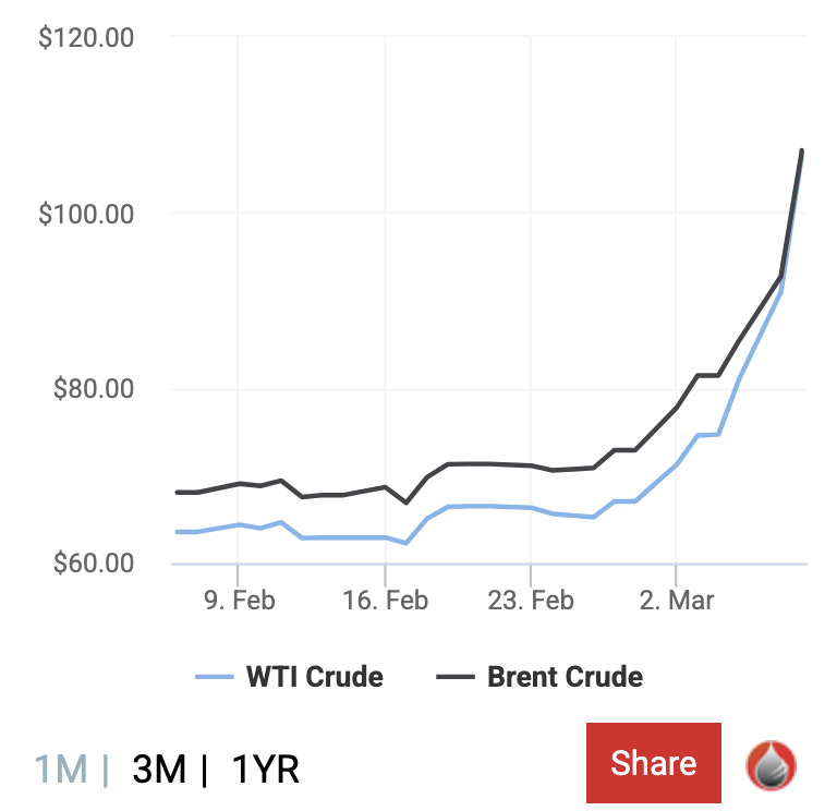Cena nafte se je v zadnjih dneh dramatično povečala. Včeraj, 8. marca 2026, so se cene na svetovnih trgih gibale med 107 in 109 dolarji za sod. Ameriški benchmark WTI je bil na ravni okoli 108–109 dolarjev za sod, mednarodni benchmark Brent pa približno med 107 in 109 dolarji. Gre za enega najhitrejših cenovnih skokov v sodobni zgodovini naftnih trgov. V primerjavi s prejšnjim tednom, po začetku vojne proti Iranu, ko so se cene gibale približno med 65 in 75 dolarji za sod, to pomeni rast za več kot 40 do 60 % v manj kot 10 dneh. V zadnjem tednu so cene narasle za približno 28 do 35 %, kar je največji tedenski skok za WTI od leta 1983. Analitiki opozarjajo, da bi lahko daljše zaprtje Hormuške ožine potisnilo cene proti 120 ali celo 150 dolarjem za sod.