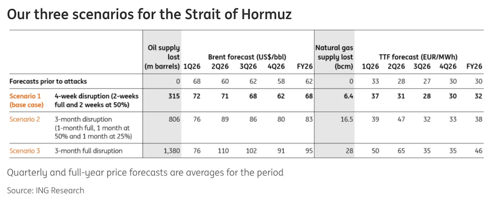 Če se vrnemo k najbolj optimističnemu (ne pa nujno tudi realističnemu) scenariju, bi po ocenah ING v primeru 1-mesečnega zaprtja Hormuza cene nafte letos vztrajale na ravni okrog 70 $/bl, v primeru 3-mesečnega zaprtja s postopnim odpiranjem bi bile cene nafte letos na ravni med 80 in 90 $/bl, v primeru popolnega 3-mesečnega zaprtja pa na ravni med 90 in 110 $/bl.