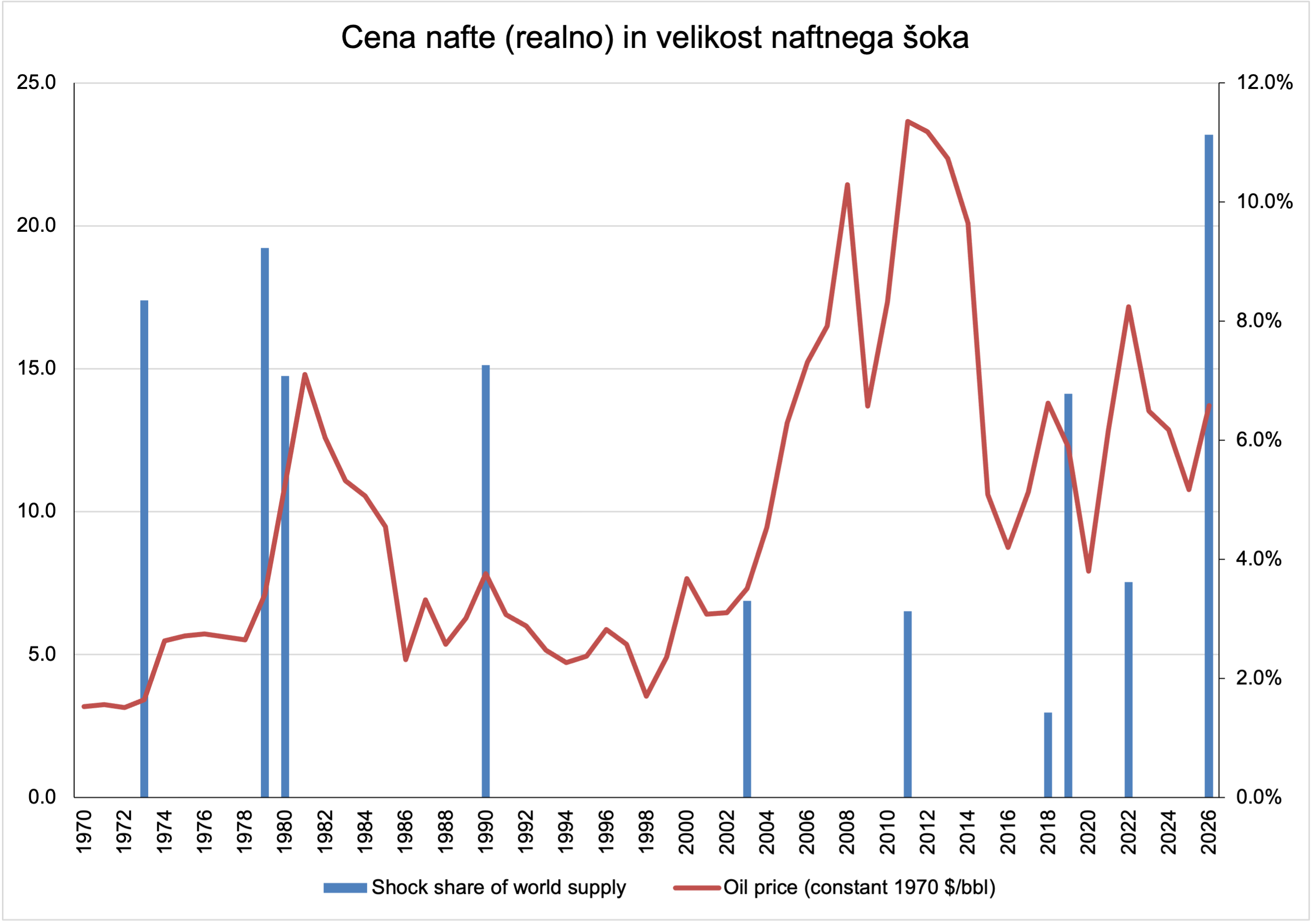 Zato lahko v prvih dneh po motnji fizično nadomestimo le približno petino do dobro četrtino tokov skozi Hormuz, medtem ko preostali izpad blažijo predvsem postopna sproščanja rezerv in prilagoditve globalnih dobavnih tokov (IEA). Torej daljše zaprtje Hormuške ožine pomeni, da bi, dokler trajajo strateške rezerve, efektivno dnevno zmanjkalo najmanj 10 do 12 mio bl/d nafte oziroma 10 do 12 %. Če to primerjamo z dosedanjimi naftnimi šoki, spodnja slika kaže, da bi ta izpad pnudbe nafte predstavljal večji globalni šok kot oba naftna šoka iz 1970-ih (1973, 19779).