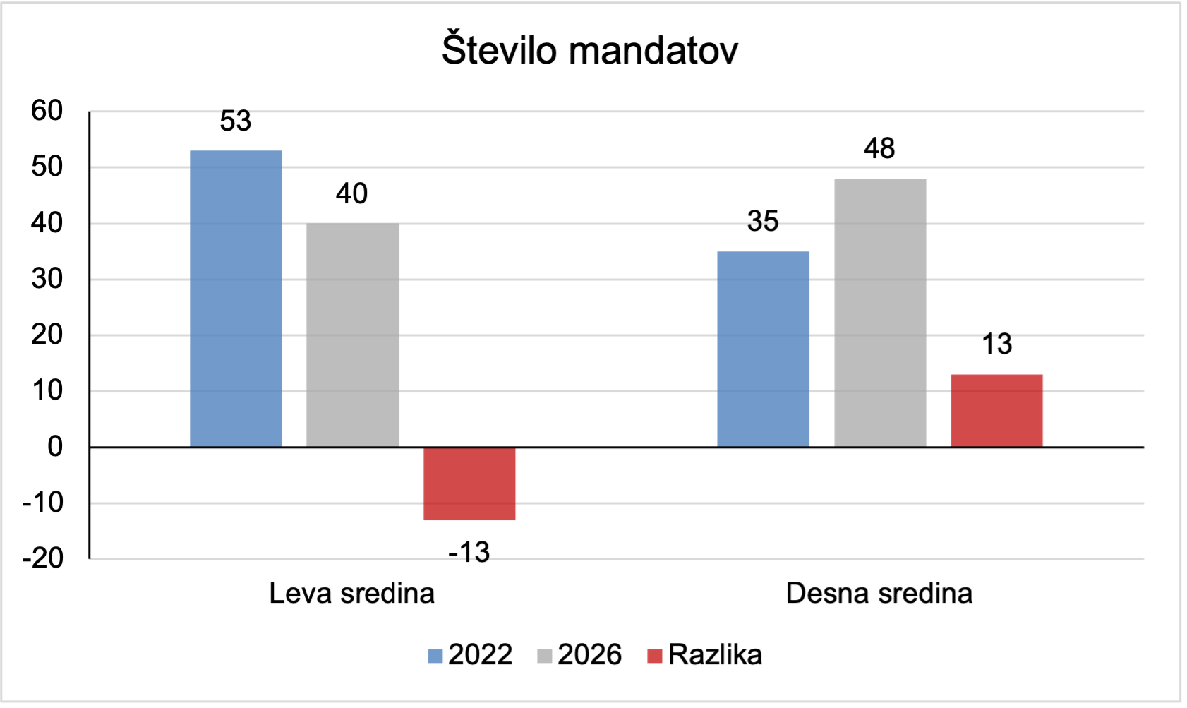 Še bolj zgovoren je premik pri mandatih strank, ki so prestopile parlamentarni prag: leva sredina je padla iz 53 mandatov v letu 2022 na 40 mandatov v letu 2026 (-13), medtem ko je desna sredina zrasla iz 35 mandatov na 48 mandatov (+13). Ta premik potrjuje, da ne gre zgolj za marginalne spremembe, temveč za strukturni premik volilnega telesa.