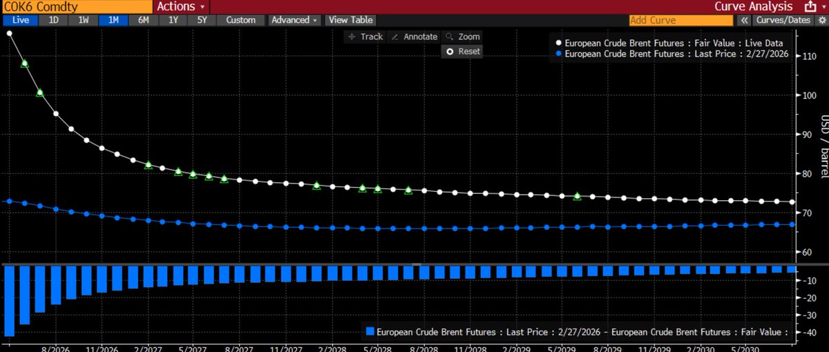 Spodnji graf, ki so ga pripravili v Morgan Stanley in ki ga je objavil Bloomberg, ilustrira kontroverzno situacijo na trgu nafte. Bela krivulja predstavlja današnje stanje krivulje terminske cene Brent nafte: cene v bližnjem roku se vzpenjajo proti 110–116 dolarjev za sodček, nato pa strmo padajo proti 70–80 dolarjem v letih 2028–2030. Modra krivulja izpred meseca dni je bila precej nižja in precej manj strma. To je vizualni prikaz učinka t.i. backwardation. To pomeni, da trg plačuje visoko premijo za takojšnjo nafto, medtem ko verjame, da se bo čez čas vse umirilo. V normalnih razmerah je krivulja contango (cene rastejo z rokom – prihodnje cene so višje). Backwardation pa pomeni obratno: trg pričakuje, da bo nafta zdaj dražja kot kasneje. V tem grafu je backwardation zelo strm, kar je signal velike kratkoročne panike zaradi motnje v dobavi. Trg pravi: „zdaj je nafte premalo, zato plačujemo premijo za takojšnjo dostavo“.